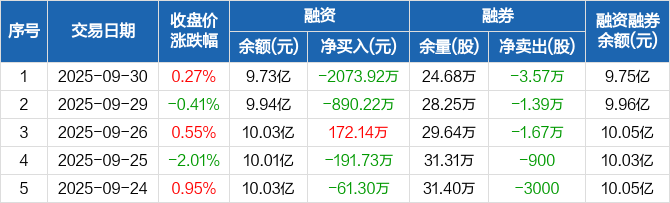 华峰超纤:融资净偿还2073.92万元,融资余额9.73亿元(09-30)