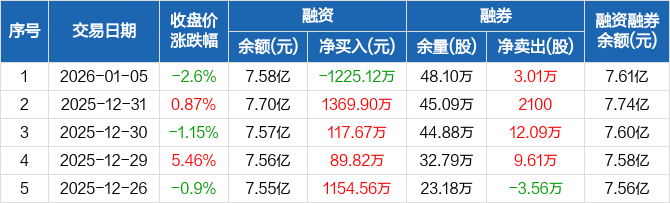 华峰超纤:融资净偿还1225.12万元,融资余额7.58亿元(01-05)