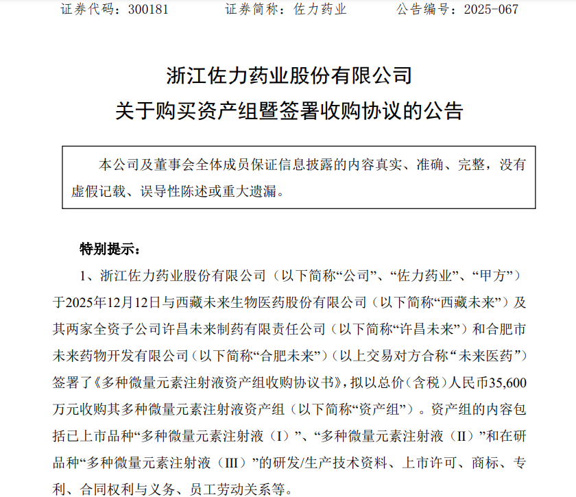 12月14日晚间,佐力药业(300181)发布公告称,公司拟以总价(含税)人民币35600万元收购西藏未来及其两家全资子公司许昌未来和合肥未来的多种微量元素注射液资产组,资产组内容包括已上市品种“多种微量元素注射液(Ⅰ)”“多种微量元素注射液(Ⅱ)”和在研品种“多种微量元素注射液(Ⅲ)”的研发/生产技术资料、上市许可、商标、专利、合同权利与义务、员工劳动关系等。