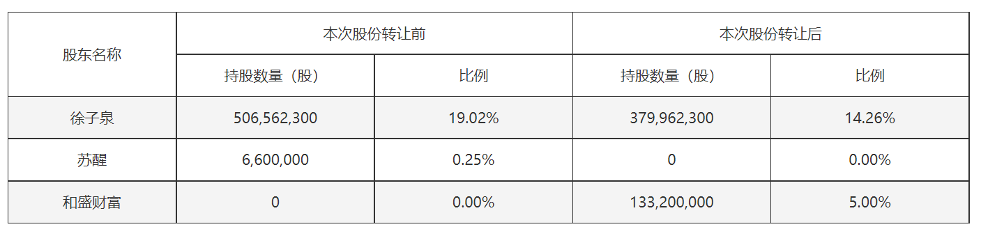 次年9月,徐子泉与张友明、华泰证券股份有限公司(简称“华泰证券”)、华泰证券(上海)资产管理有限公司(简称“华泰资管”)签署了《股份转让协议》,通过协议转让方式以股份转让价款,偿还其在华泰证券和华泰资管的全部质押债务。本次股份转让的转让价格为5元/股,股份转让价款为42500万元。