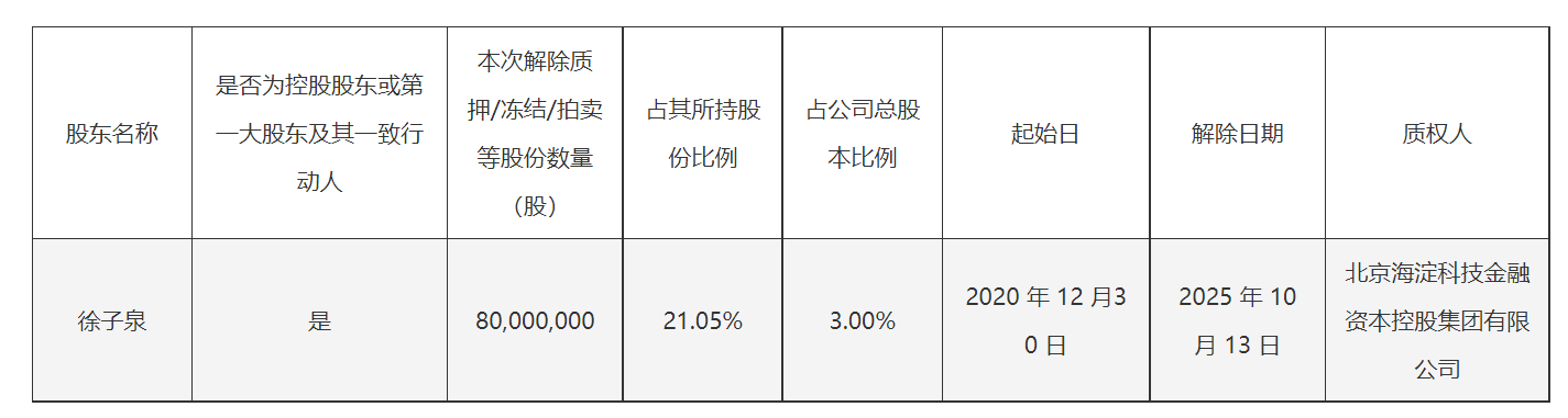 截至2025年10月14日,徐子泉及其一致行动人所持质押股份情况。公告截图