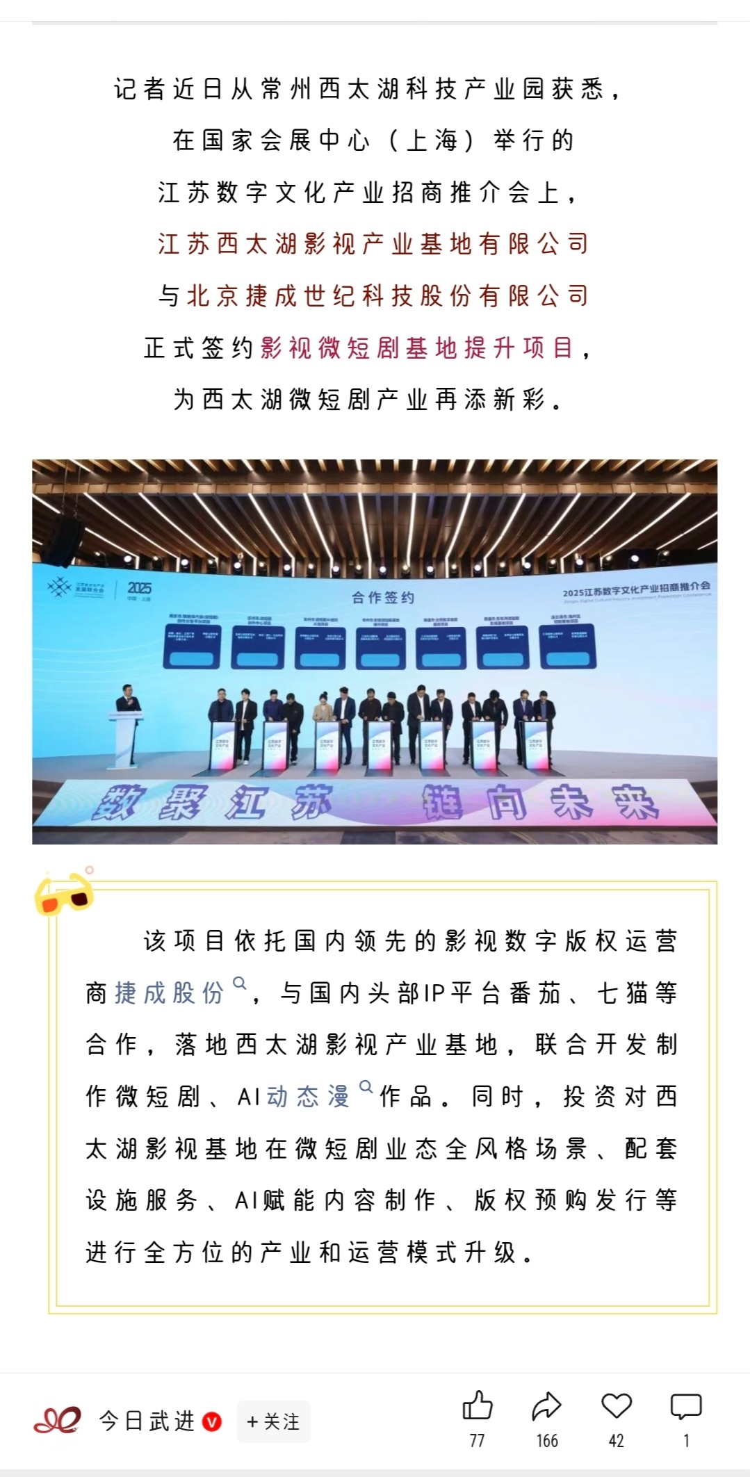 家人们,捷成股份再次联手字节跳动番茄,和西太湖影视成立微短剧项目,制漫剧等