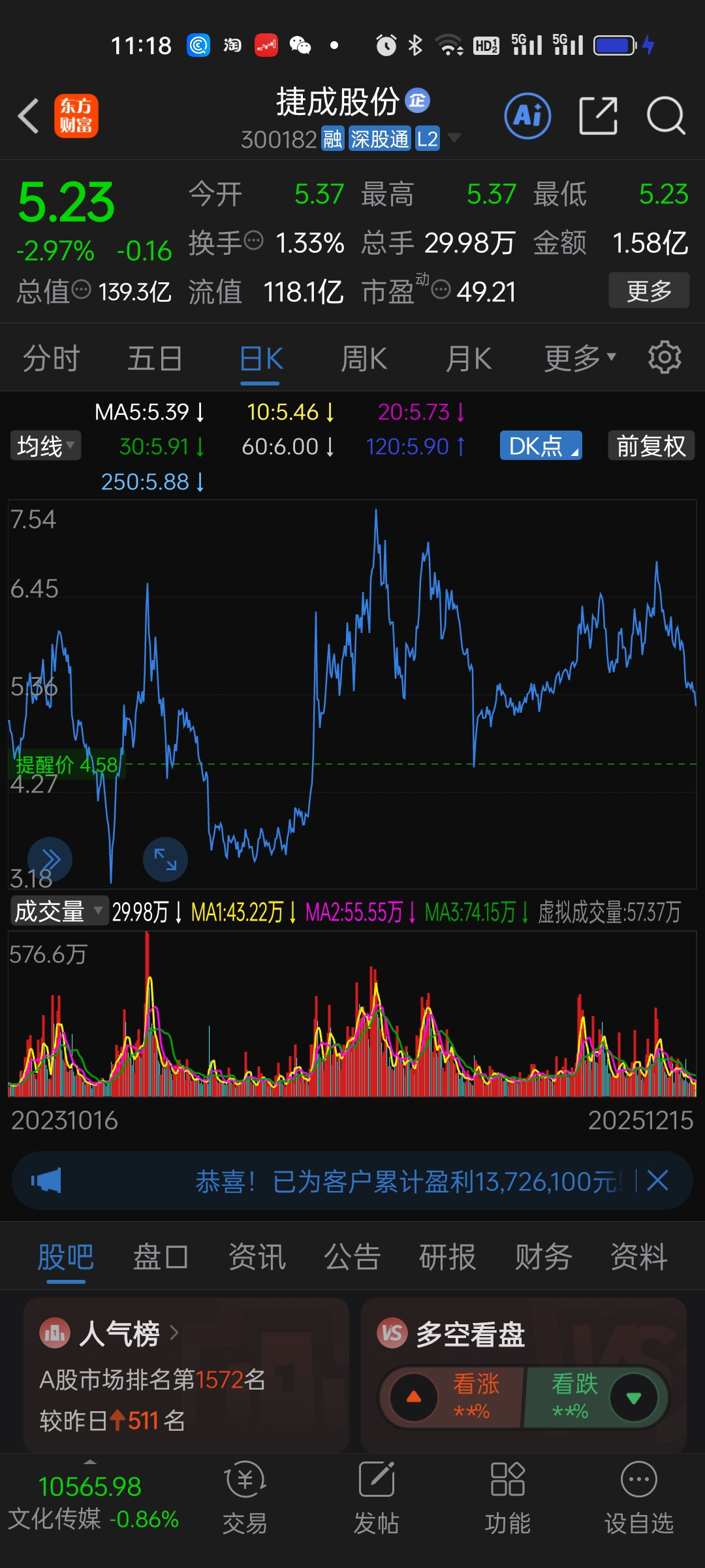 $捷成股份(SZ300182)$ 这个弔戼要回到4.58一线了