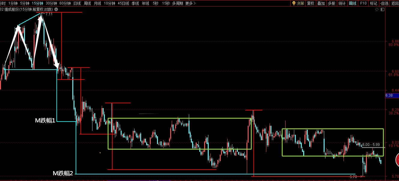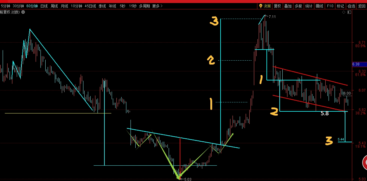 蓝线M头跌幅,红线等距跌幅,5.8是M头2波跌幅买点,跌破5.8可能有三波跌幅5
