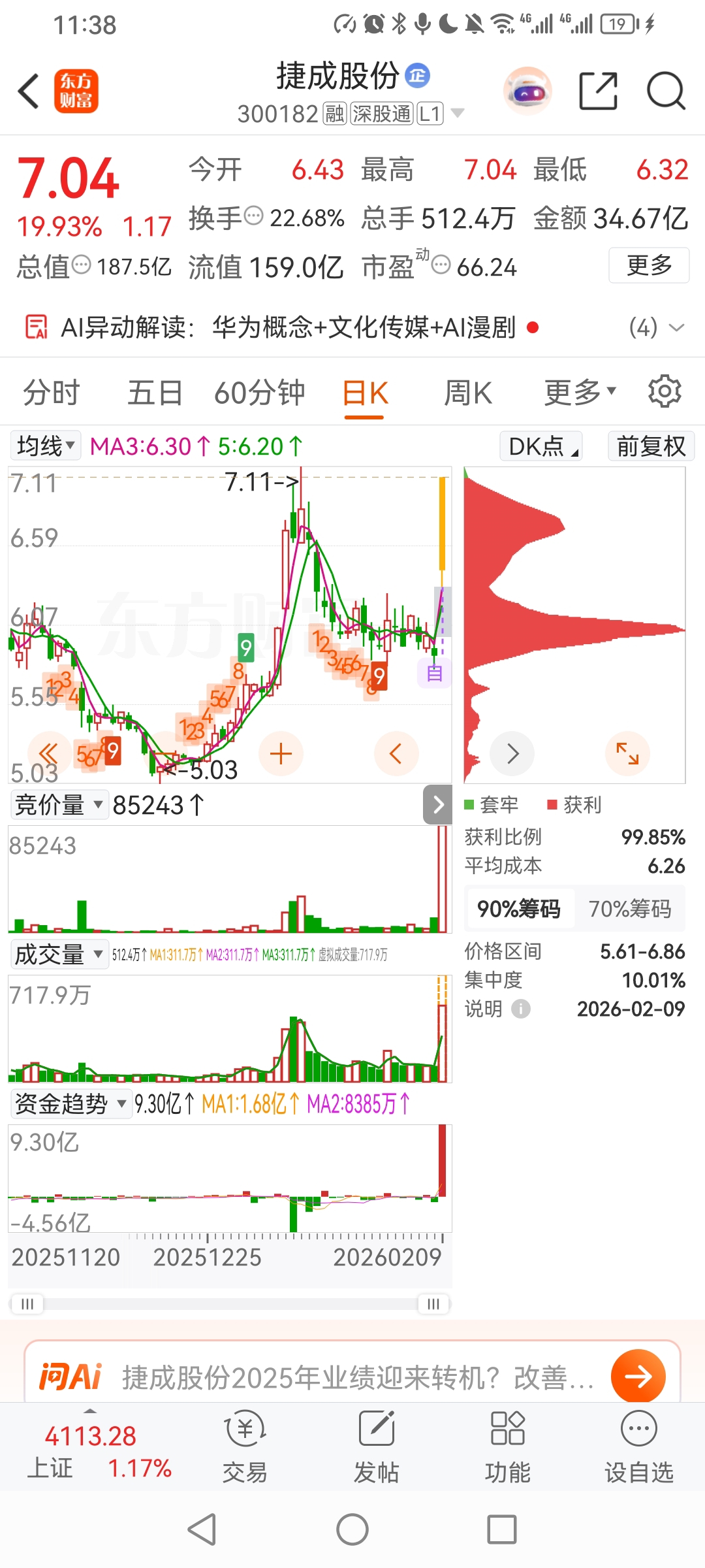 军哥军团文化传媒盯盘股票。捷成技术,成交量。