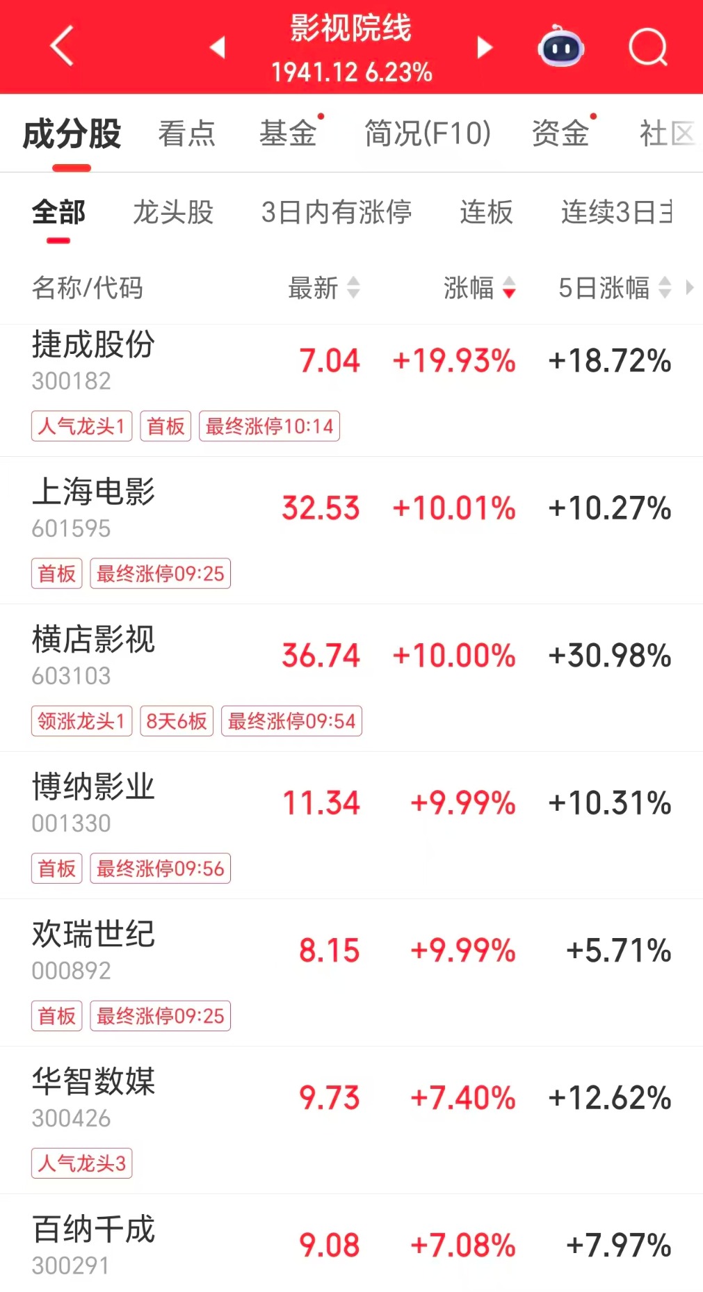 2月9日,影视院线板块强势走高。其中,捷成股份、上海电影、横店影视、博纳影业、欢瑞世纪等多股涨停,华智数媒、百纳千成、华策影视、华谊兄弟等跟涨。