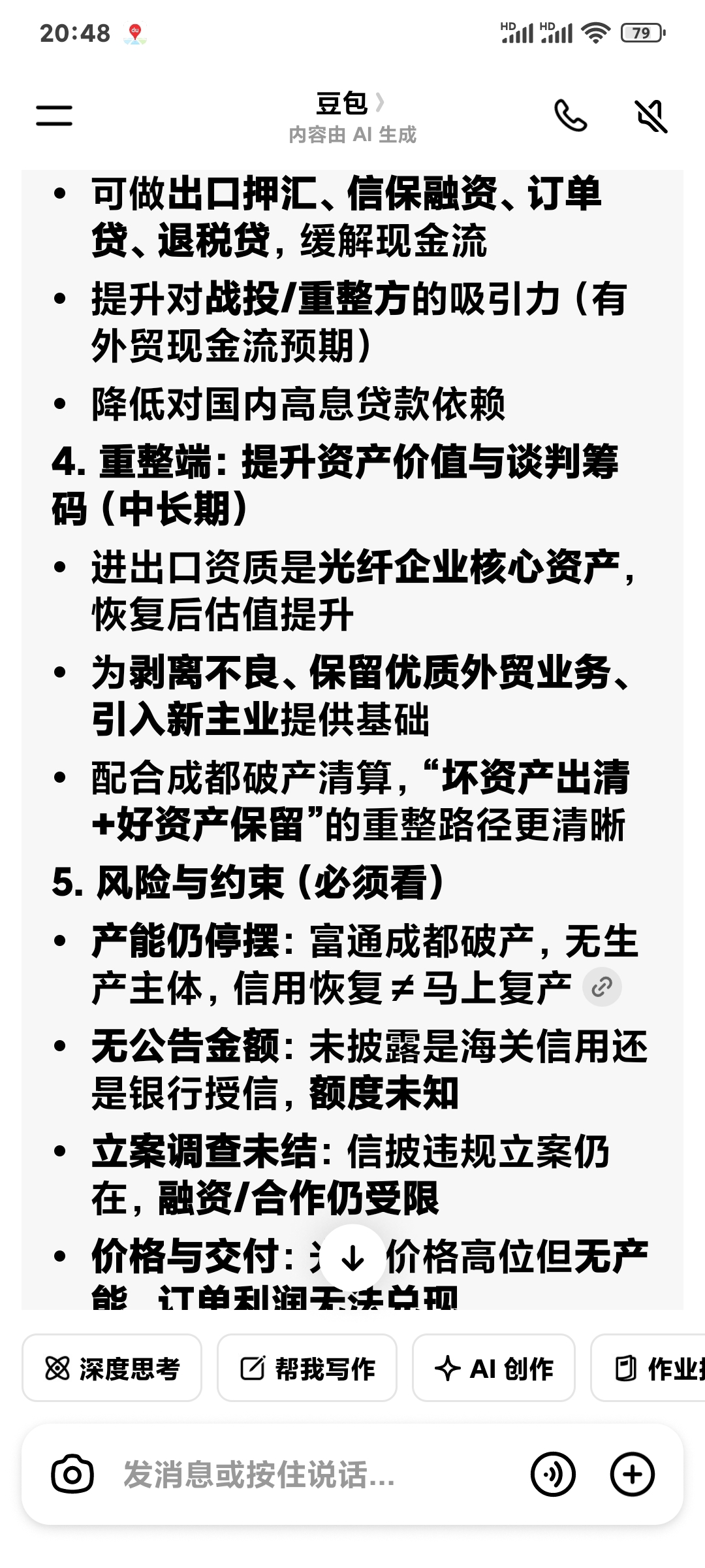 - 这是**“止血+铺路”的关键一步:恢复进出口信用=打通订单-生产-收款的闭环,但产能、资金、重整进度仍是决定胜负的核心变量**。
