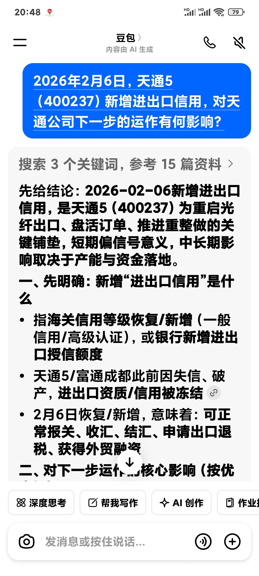 2026-02-06新增进出口信用,是天通5(400237)为重启光纤出口、盘活订单、推进重整做的关键铺垫,短期偏信号意义,中长期影响取决于产能与资金落地。