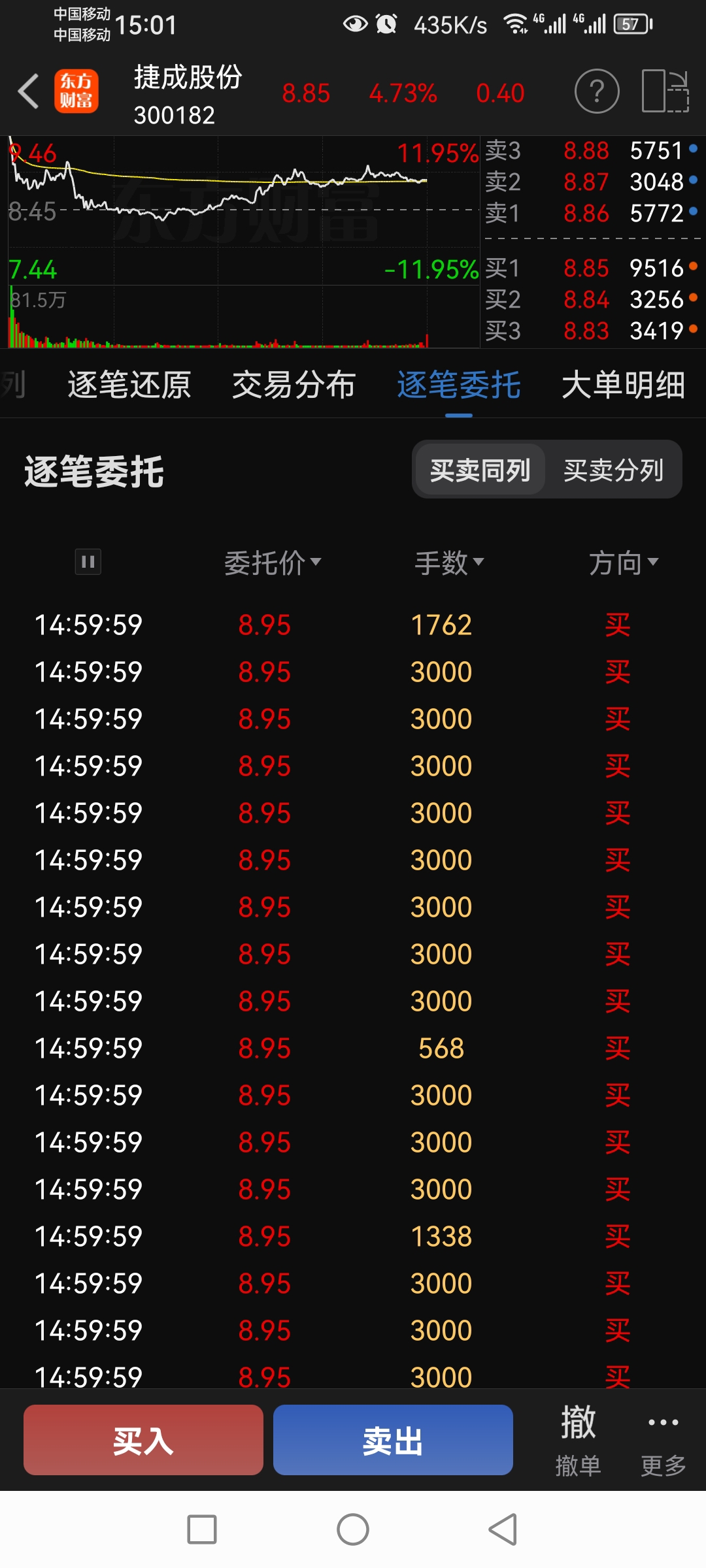 $捷成股份(SZ300182)$ 尾盘这14个3000手应该是佛山无影脚回来抄底了,明天高开是必须的