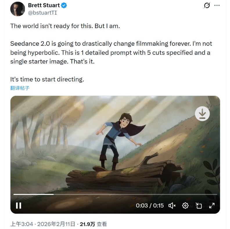导演Brett Stuart发布了一条15秒的动画短片,是一个少年跟小狗在树林追逐的故事,包括少年和小狗的对话以及紧凑的动作。Brett Stuart表示,“世界还没准备好迎接这个。但我已经准备好了。Seedance 2.0将彻底改变电影制作的未来。我可不是在夸张。这只是一个包含5个镜头设定和一张起始图像的prompt。就这么简单。”