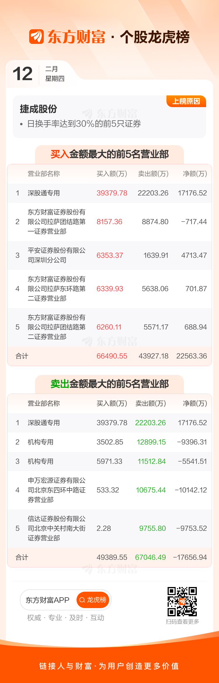 交易所2026年2月12日公布的交易公开信息显示,捷成股份因成为日换手率达到30%的前5只证券上榜。捷成股份当日收报8.95元,涨跌幅1.13%,偏离值37.69%,换手率40.28%,成交额80.20亿。