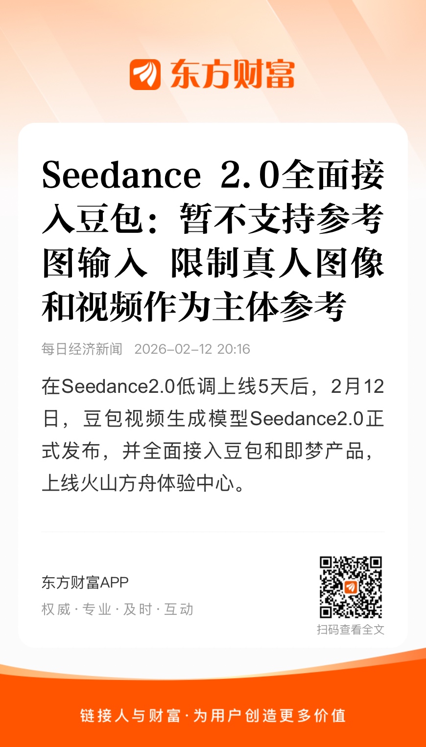 值得一提的是,对于此前颇有争议的版权问题,字节跳动官方在12日明确作出限制:“目前,Seedance 2.0限制了真人图像/视频作为主体参考。如需使用真人作为主体参考,须经本人验证或取得授权。”