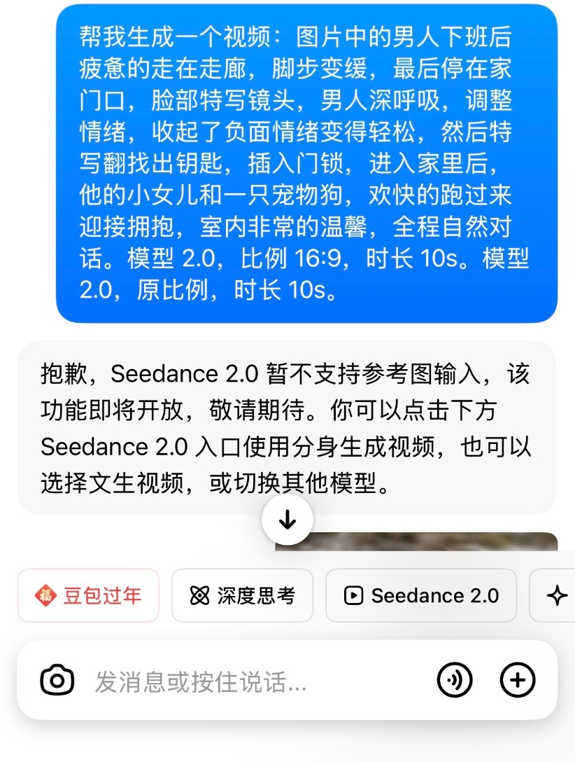 《每日经济新闻》记者随即在豆包App(应用程序)对规范情况进行了测试。目前在豆包App使用Seedance 2.0生成视频时,不支持“参考图”功能。记者分别测试了风景图和真人参考图,豆包均无法生成视频并回复:“Seedance 2.0暂不支持参考图输入,该功能即将开放,敬请期待。”