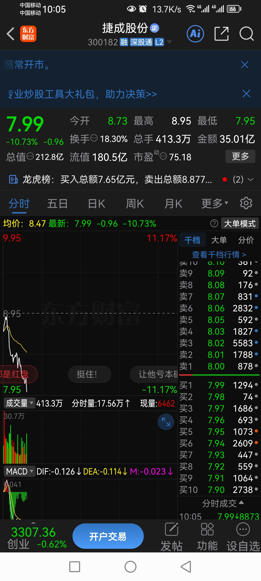 $捷成股份(SZ300182)$ 跑步前进抄底抄底,破8元整数关口做空动能已大幅减弱,而且板块全体红盘8元应该是安全区域了