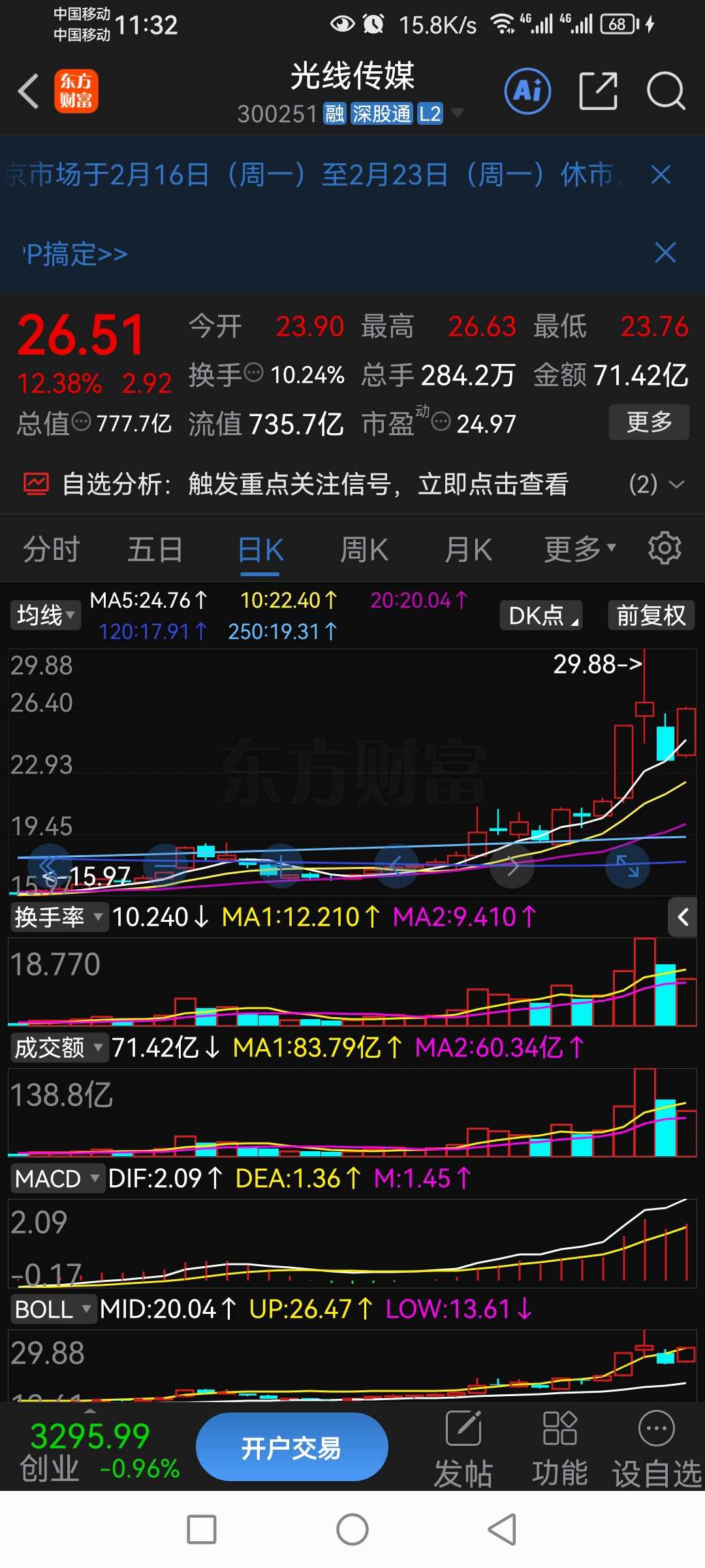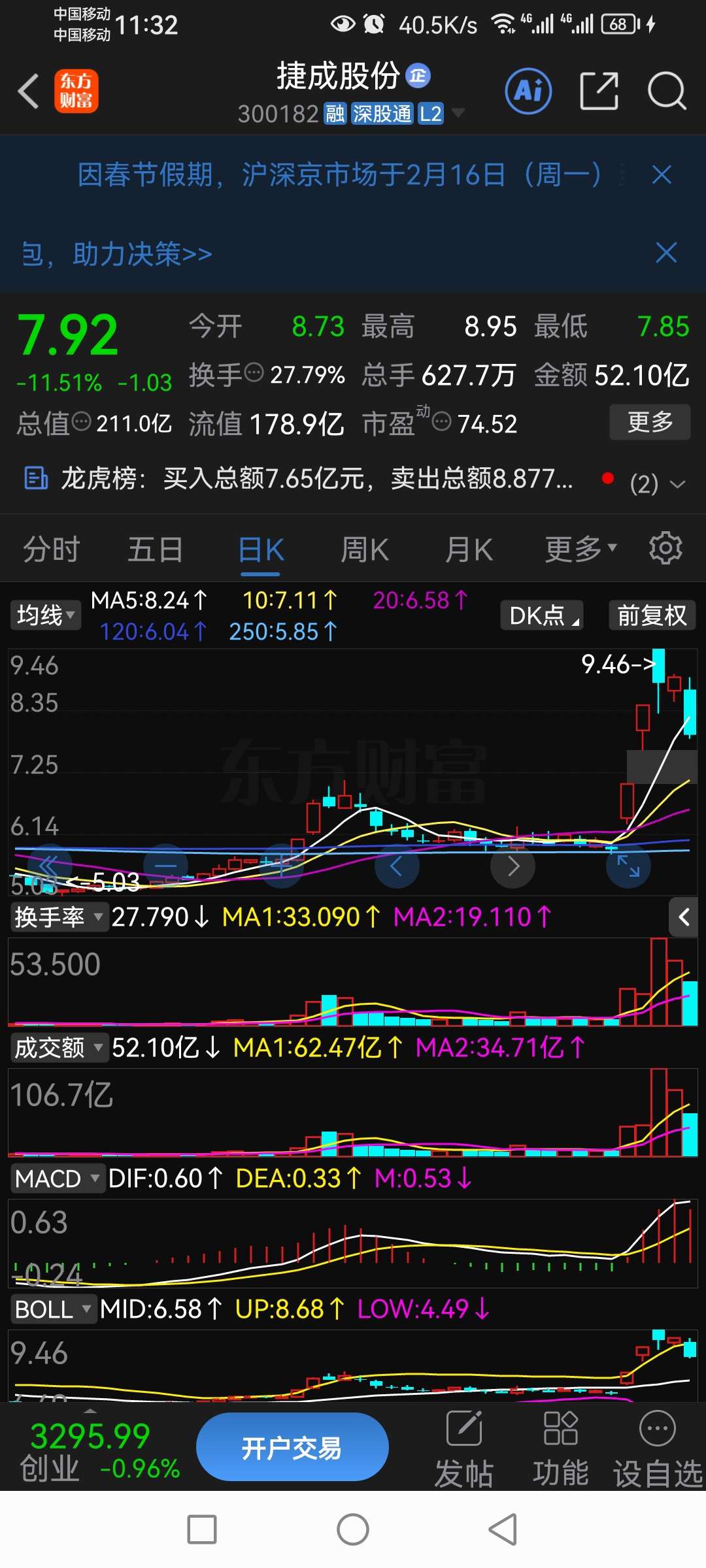 走势和光线传媒差不多昨天光线收了根-12%的大阴线今天强劲反弹,年后捷成股份应该