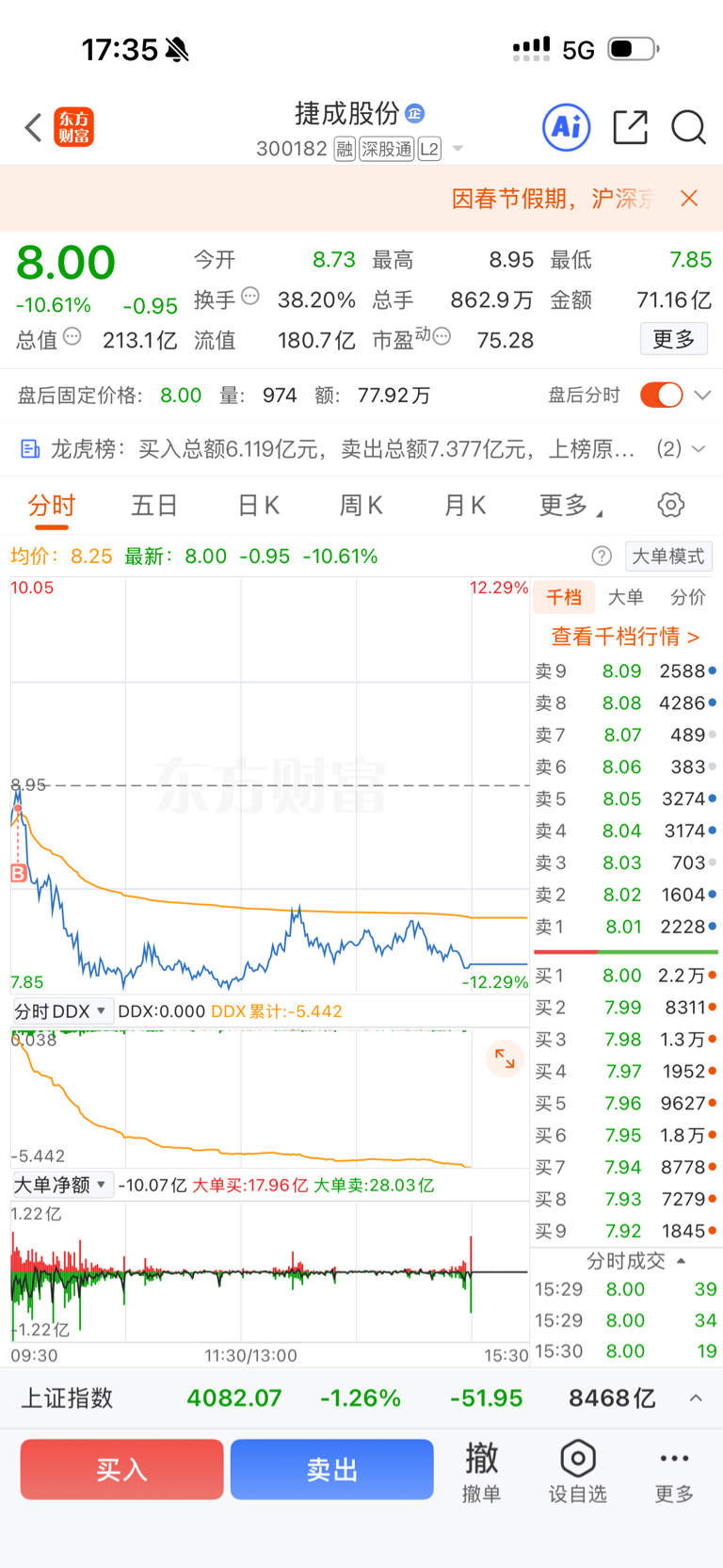 $捷成股份(SZ300182)$ 什么鬼操作,在建新赚的十个点,在捷成亏了十个点,收盘一看只赚了200块
