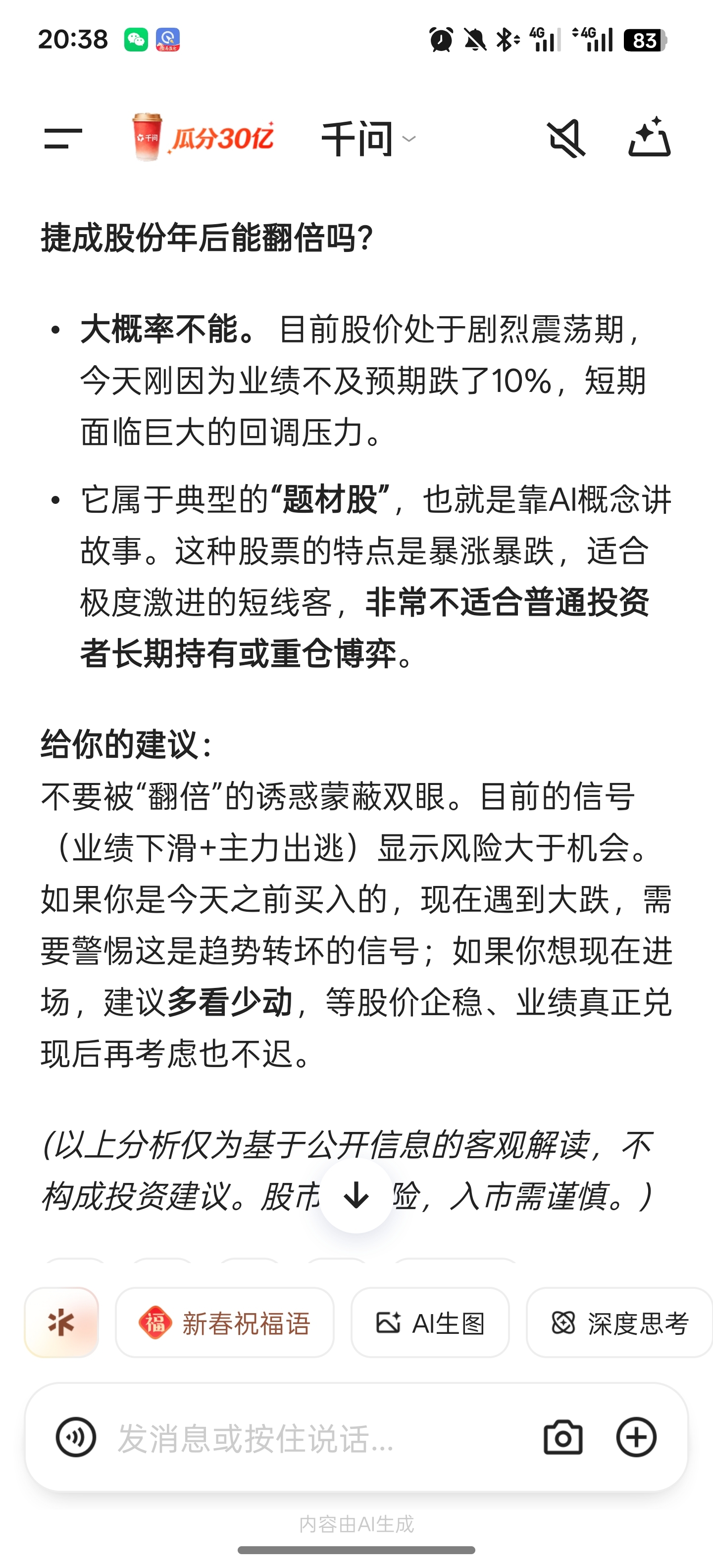 郑重声明:用户在财富号/股吧/博客等社区发表的所有信息(包括但不限于文字、视频、音频、数据及图表)仅代表个人观点,与本网站立场无关,不对您构成任何投资建议,据此操作风险自担。请勿相信代客理财、免费荐股和炒股培训等宣传内容,远离非法证券活动。请勿添加发言用户的手机号码、公众号、微博、微信及QQ等信息,谨防上当受骗!