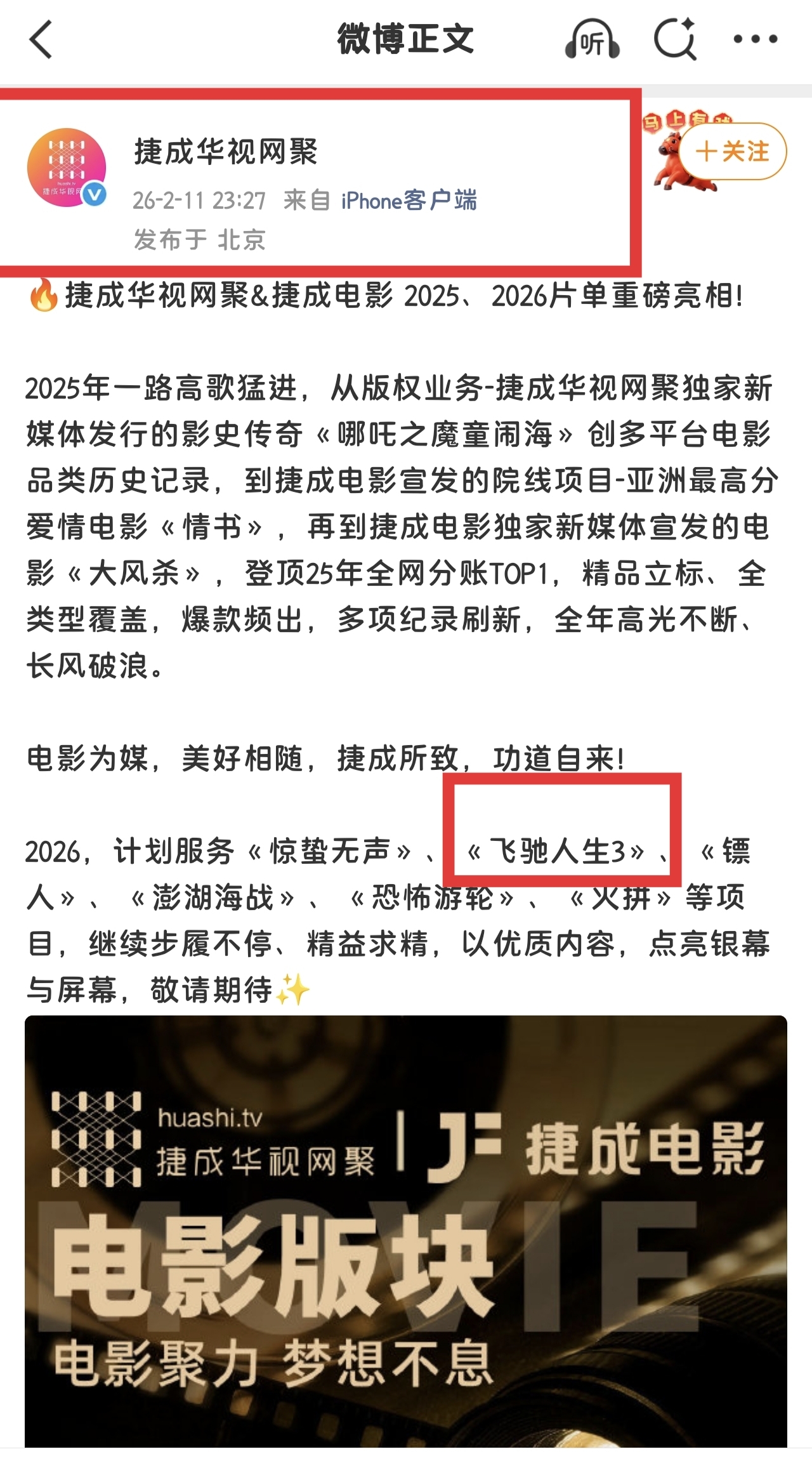 根据捷成华视网聚(捷成股份旗下核心平台)2026年2月11日发布的官方片单,以下几部电影都与捷成股份有明确业务关联: 1.《惊蛰无声》捷成将为该片提供宣发及新媒体发行服务,是其2026年重点布局的头部影片之一。2.《飞驰人生3》作为2026年春节档核心影片,捷成已将其纳入2026年服务片单,后续将负责新媒体发行等版权运营。3.《镖人》(微博中“骠人”为笔误,实际为《镖人:风起大漠》)捷成将为该片提供宣发及新媒体发行服务,是其“版权为王”逻辑下的重要IP。4.《澎湖海战》捷成将为该片提供宣发及新媒体发行服务。5.《恐怖游轮》捷成将为该片提供宣发及新媒体发行服务。6.《火拼》捷成将为该片提供宣发及新媒体发行服务。 简单来说,微博中列出的全部6部影片,都在捷成股份2026年的重点片单中,公司将通过旗下的捷成华视网聚和捷成电影,为这些影片提供宣发、新媒体发行等版权运营服务,从而实现版权变现。