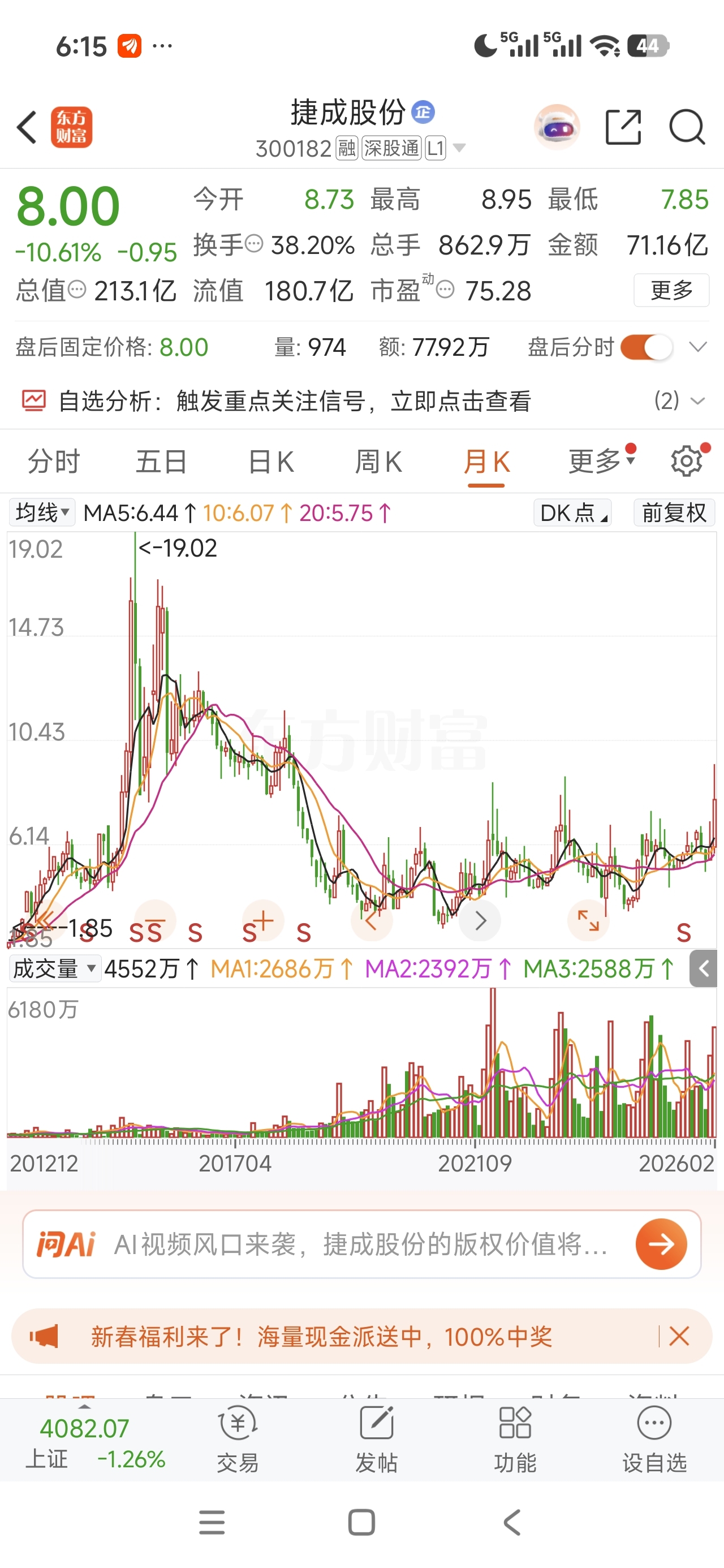 捷成股份股价从长期底部(约6元)启动,月K线突破了2017年以来的震荡区间,属于典型主升浪的“底部放量突破”。近期单日成交额超100亿,换手率达53.5%,是历史天量级别,说明筹码交换极其充分,有超级大主力入驻 //@静待春花开 :这种捷成股份底部票就是黄金坑,已经很少有了