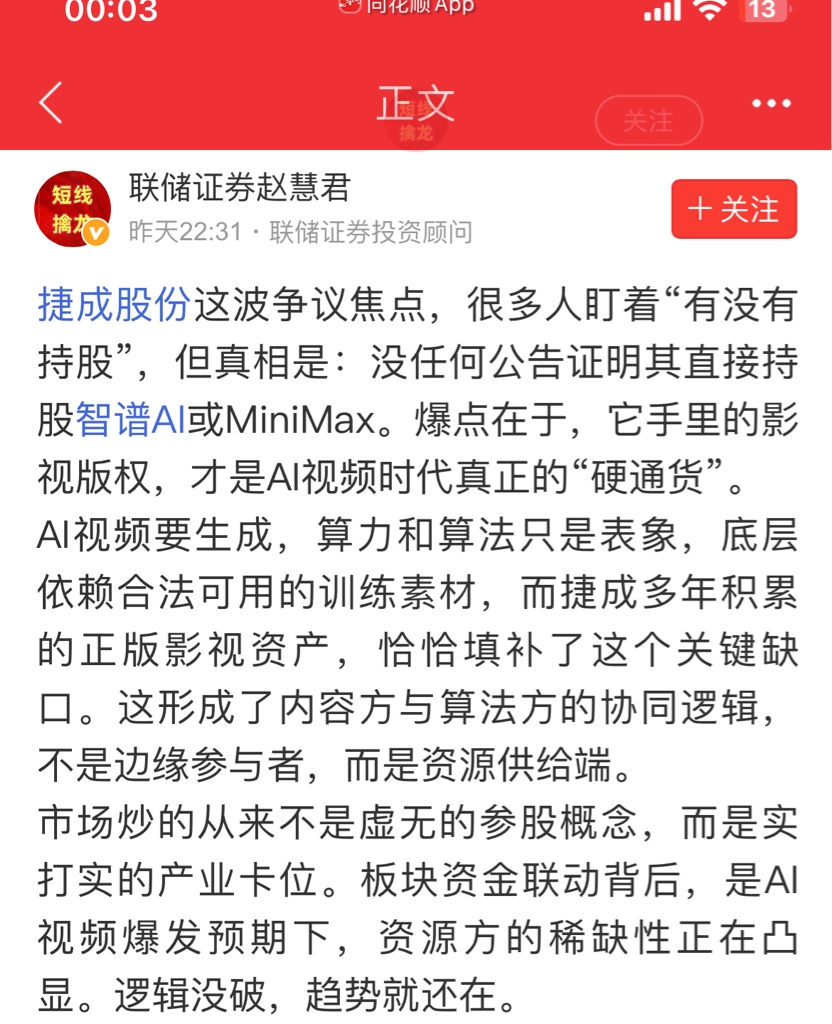 捷成先拉2个涨停