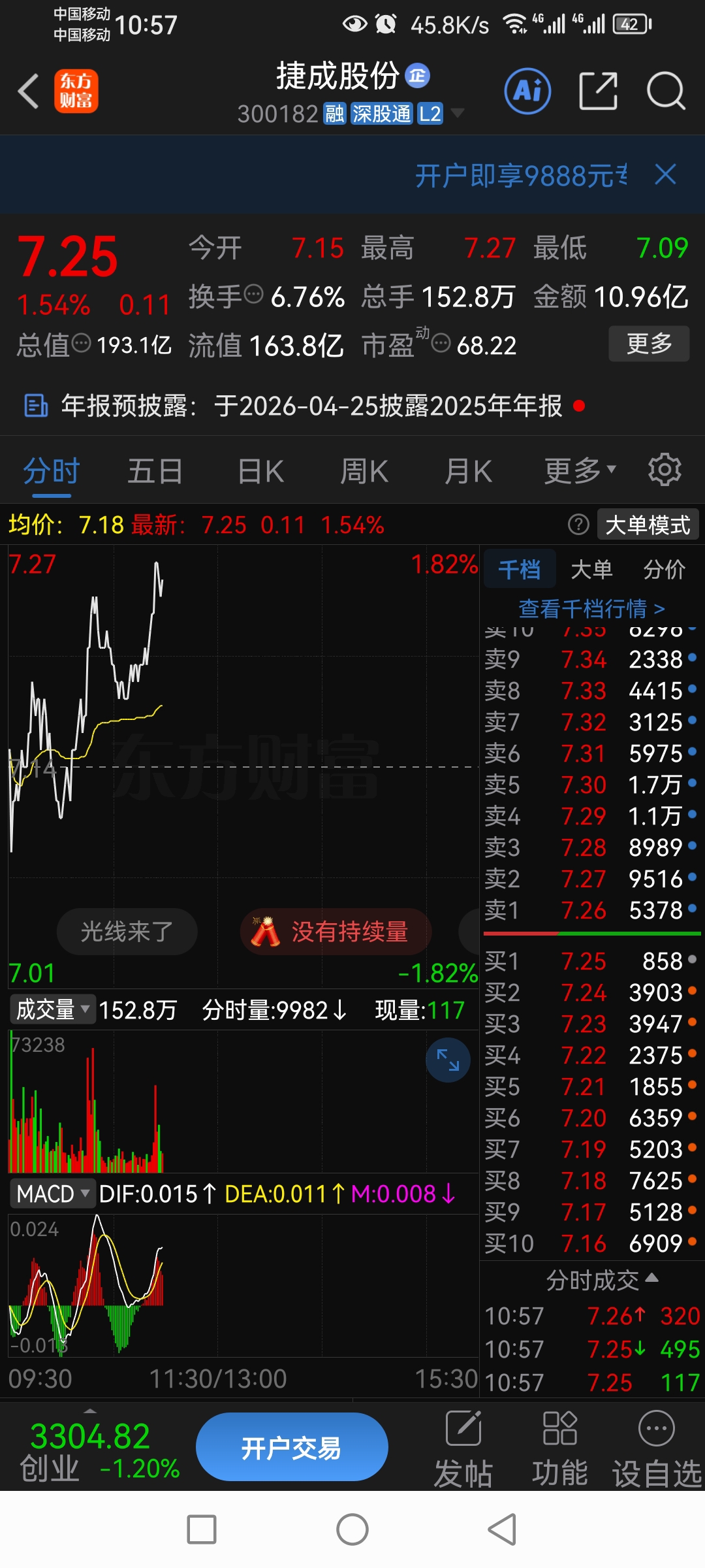 $捷成股份(SZ300182)$ 7.25元做T先清仓了,下午择机再低吸回来,今天预期又是缩量调整的一天