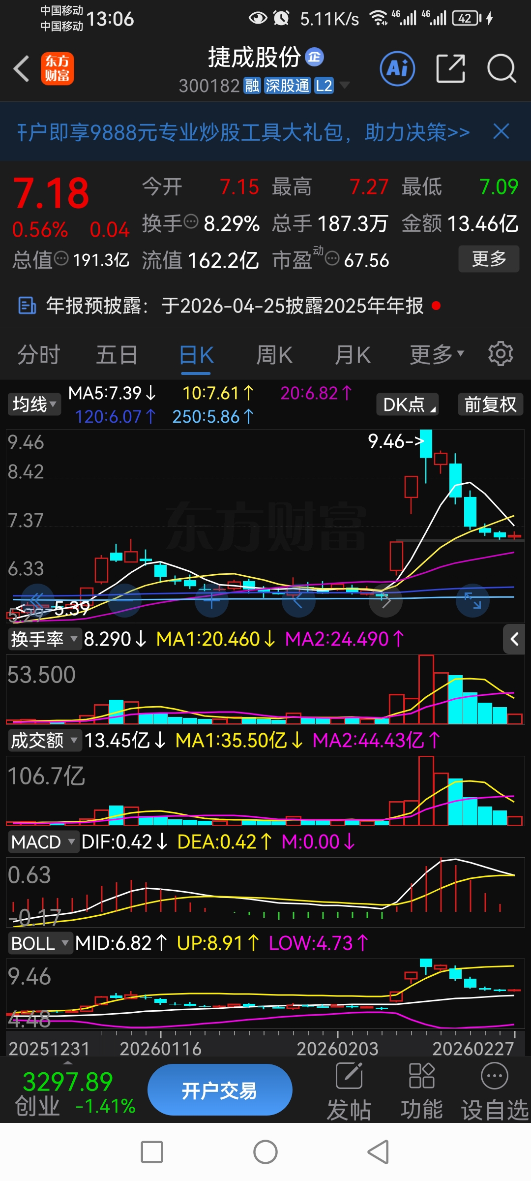 下星期一在20日均线6.93元附近回抄(回䃼前期向上跳空高开缺口7.04元)
