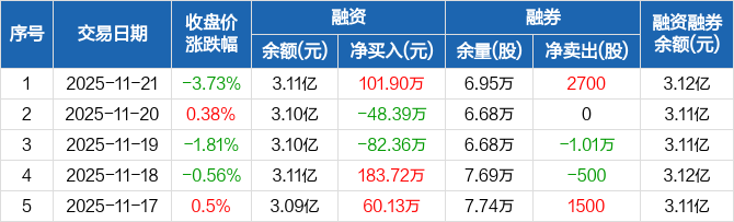 融资方面,当日融资买入1180.95万元,融资偿还1079.05万元,融资净买入101.9万元。融券方面,融券卖出3100股,融券偿还400股,融券余量6.95万股,融券余额105.78万元。融资融券余额合计3.12亿元。