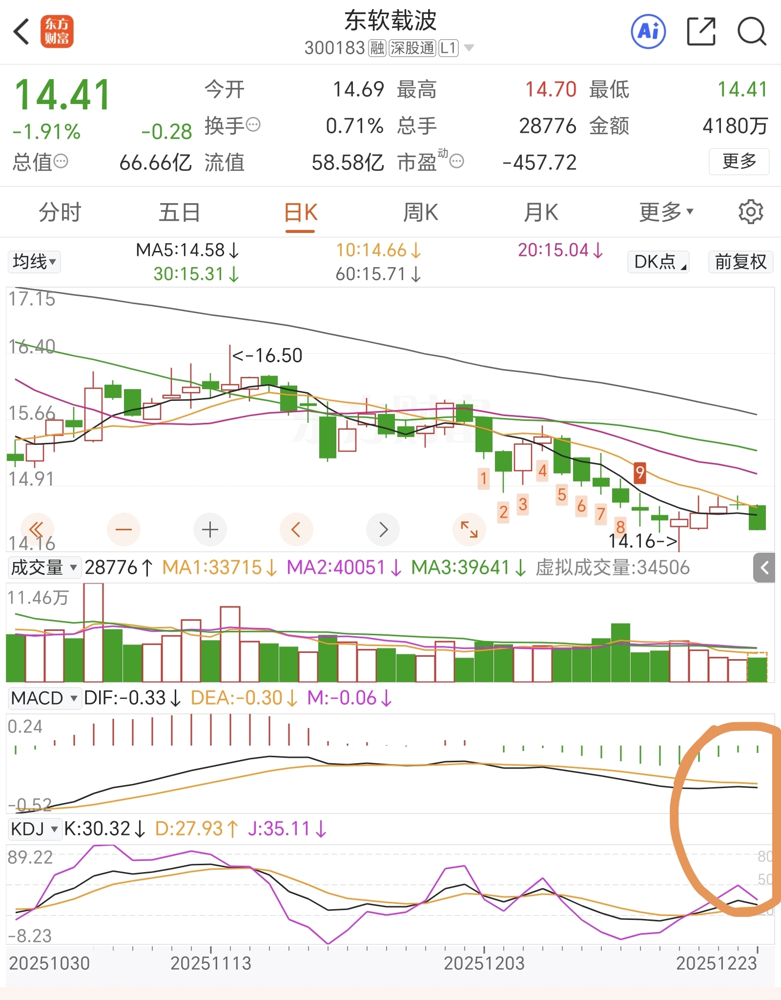 $东软载波(SZ300183)$ MACD倒鸭嘴,大爆跌马上开始,14元的日子估计也要永别了