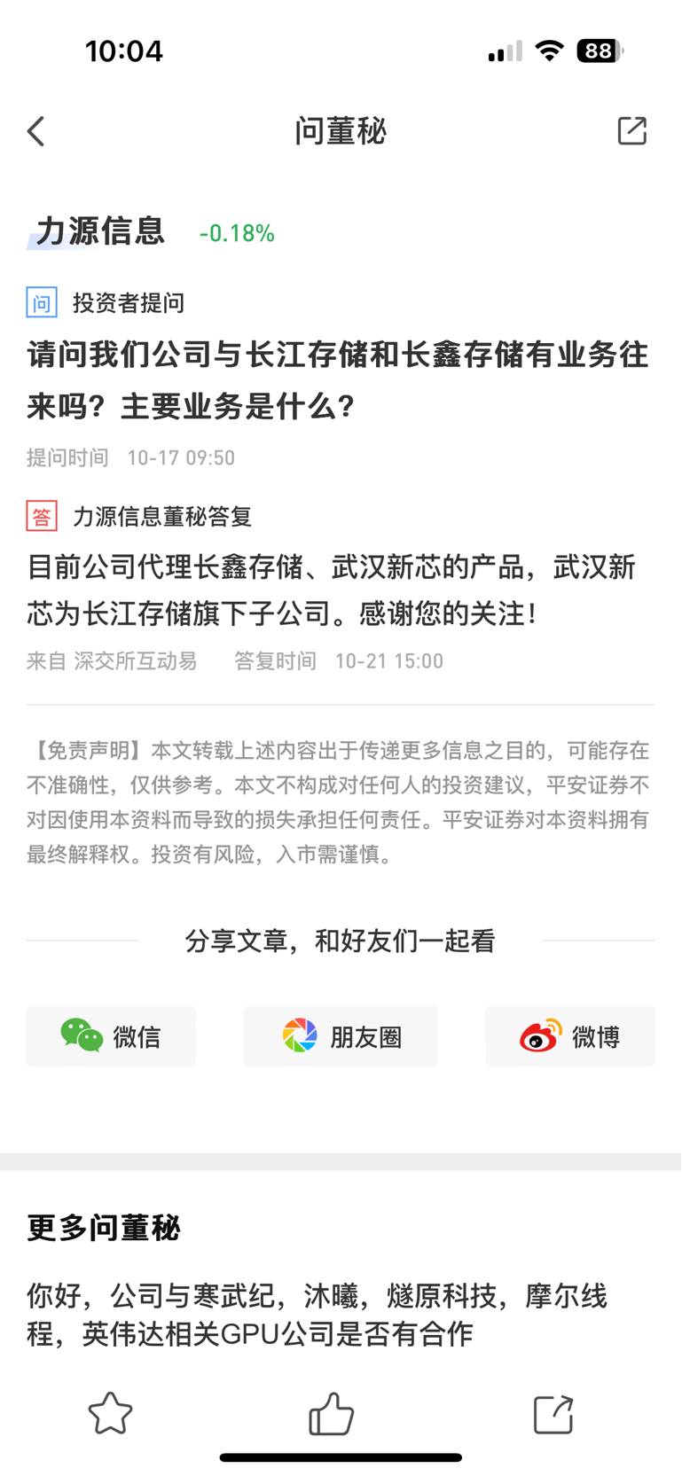 $力源信息(SZ300184)$ 【:在存储产业链紧张背景下 公司存储相关业务销售额有所提升】财联社10月29日电,在互动平台表示,公司代理的存储产品线涵盖、铠侠、、长鑫存储、海康、恒烁、天勤、、武汉新芯等知名品牌。在存储产业链紧张背景下,公司存储相关业务销售额有所提升,对业绩产生一定的积极作用。