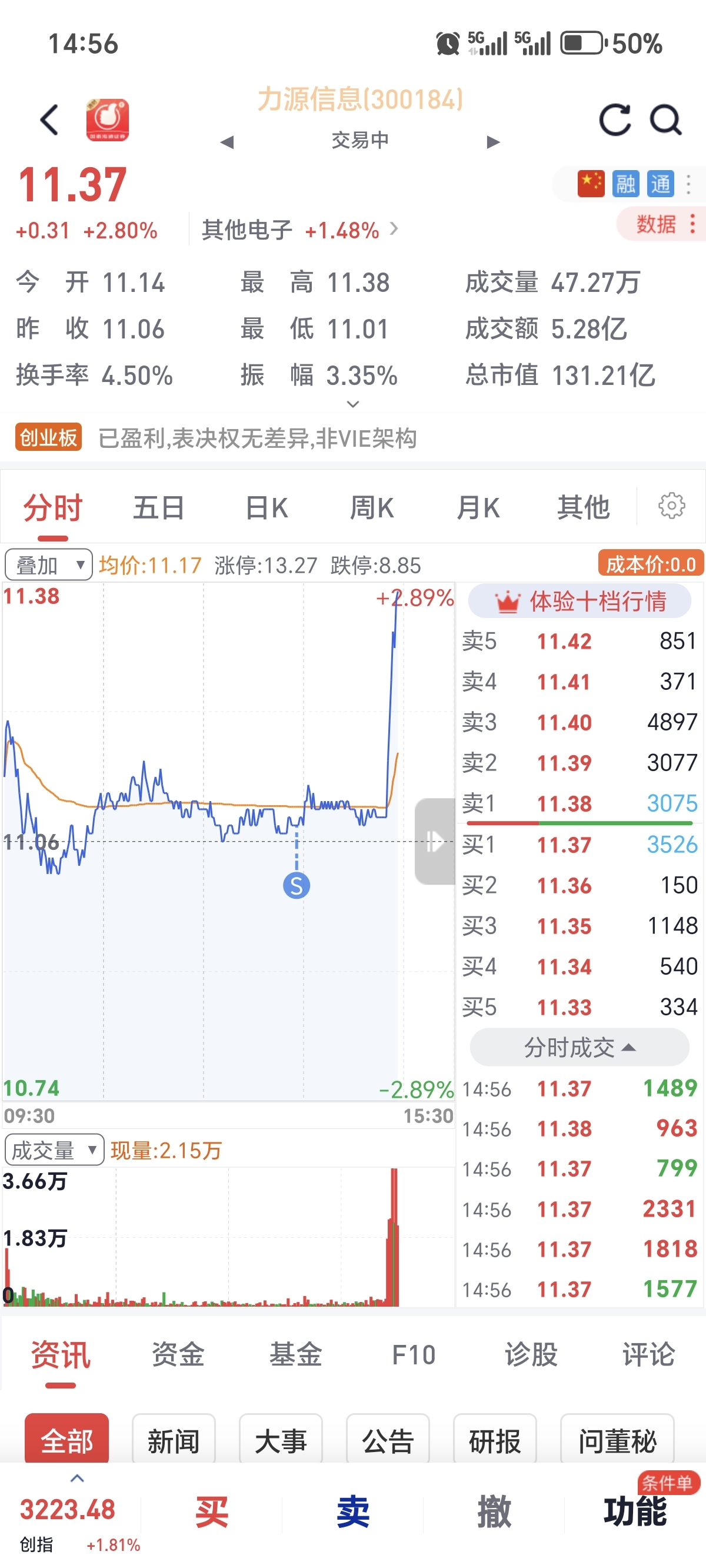 $力源信息(SZ300184)$ 拿了半个多月,今天实在受不了这种阴跌,清了!