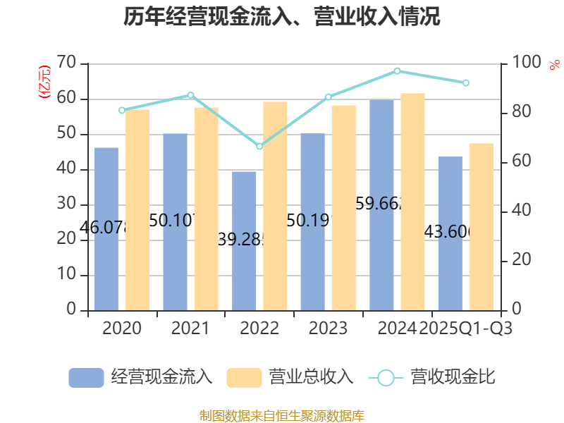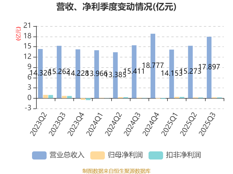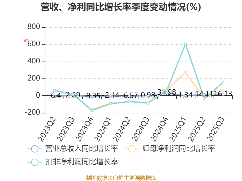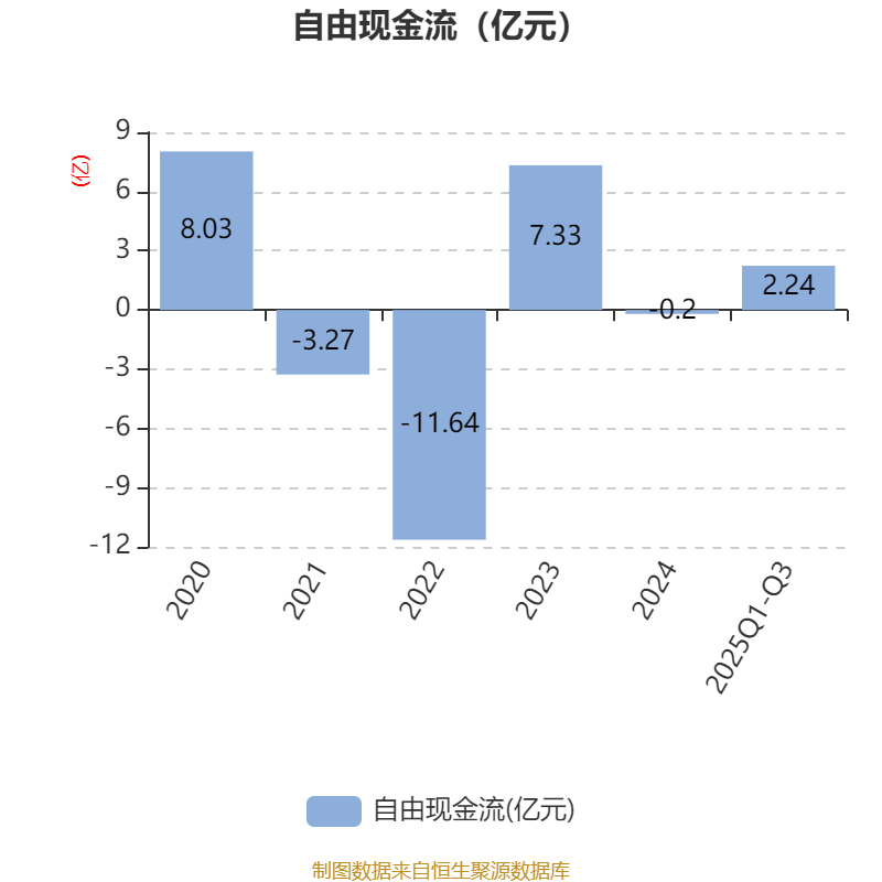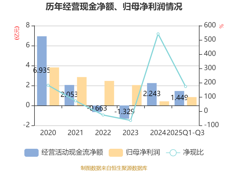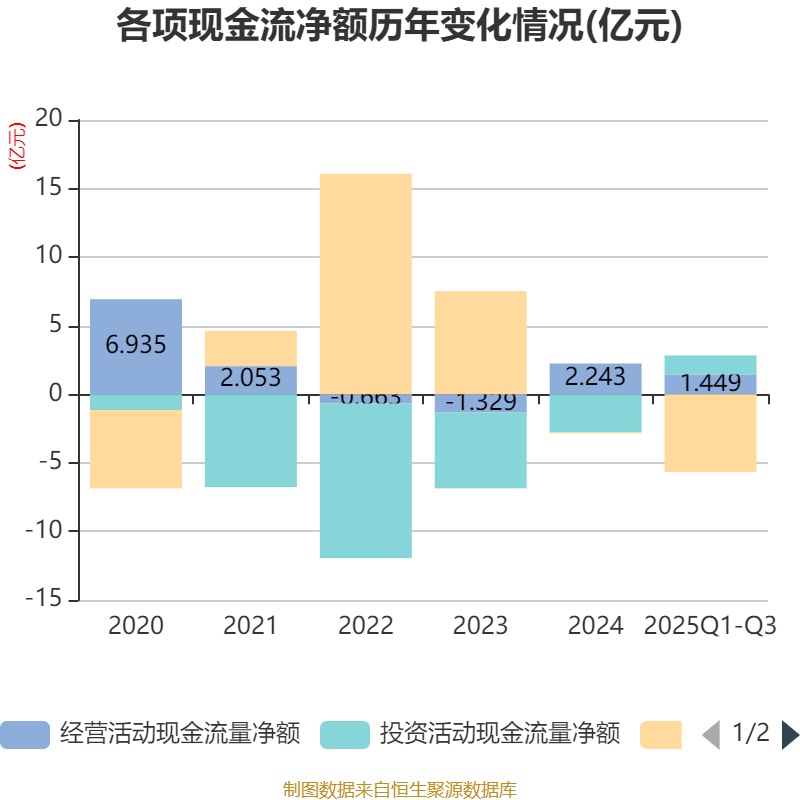 2025年前三季度,公司经营活动现金流净额为1.45亿元,同比增长13.47%;筹资活动现金流净额-5.67亿元,同比减少5亿元;投资活动现金流净额1.38亿元,上年同期为-1.3亿元。