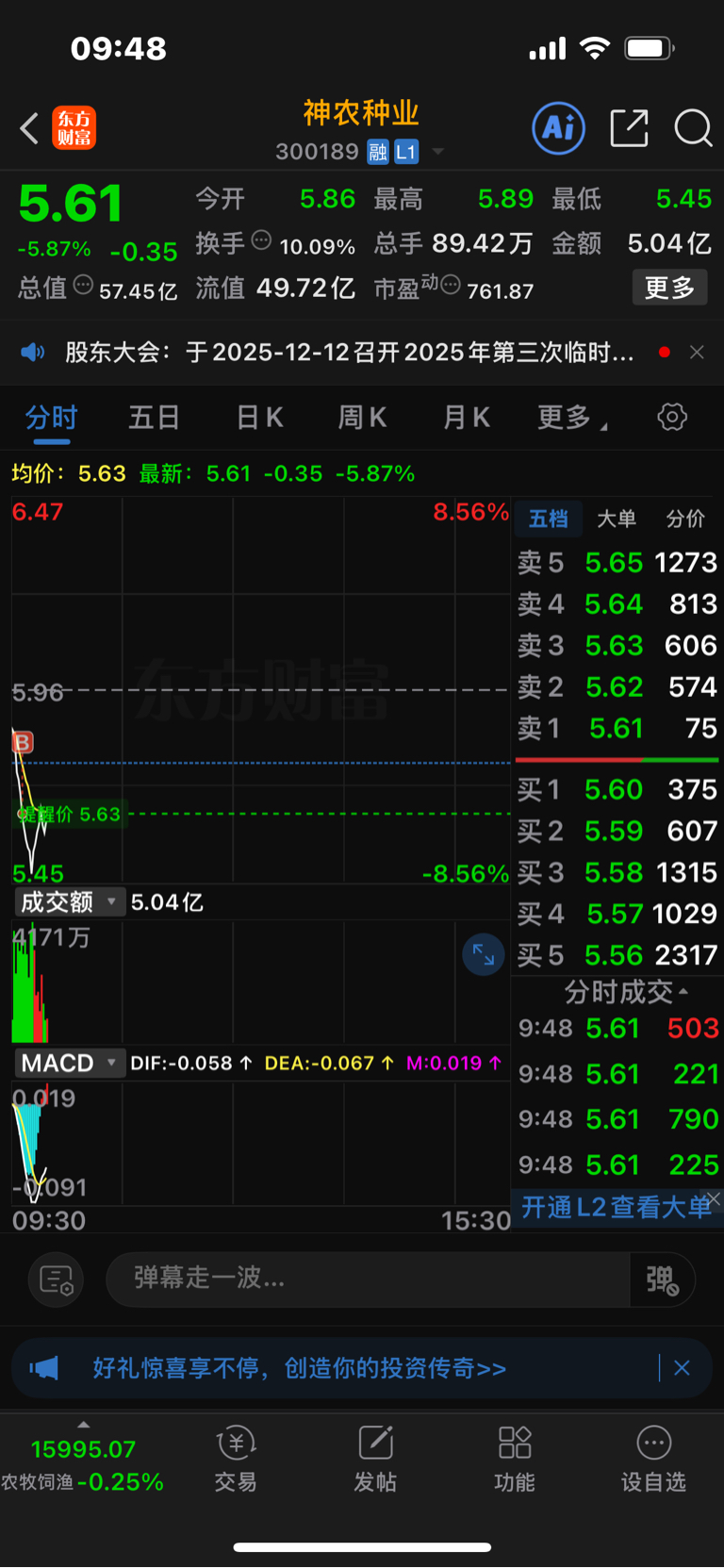 $神农种业(SZ300189)$ 补的早了点,二次补仓挂在5.43没砸到