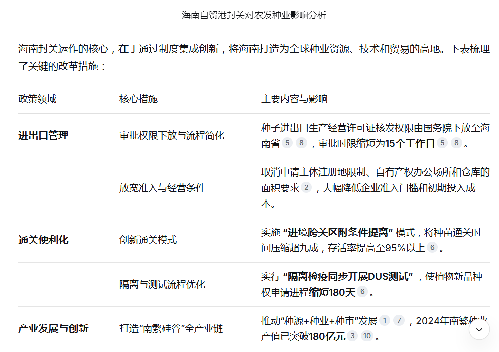海南成果“走出去”:在海南研发、繁育的优质品种,可以借助自贸港的贸易便利政策,更高效地辐射国内市场或出口至“一带一路”沿线及其他热区国家 - 深度融入创新与产业生态 融入产业高地:封关后,政策红利将加速释放-3,超过2800家种业创新企业已集聚崖州湾-3-10。入驻此地有助于企业接触前沿技术、顶尖人才和潜在合作伙伴