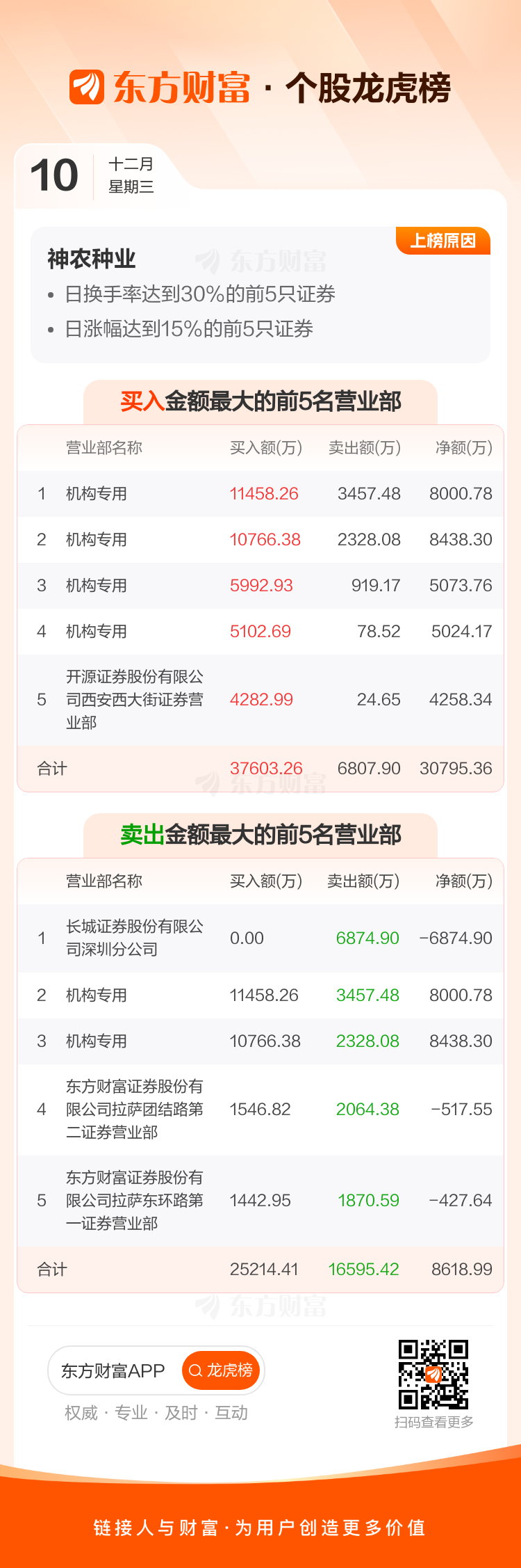 交易所2025年12月10日公布的交易公开信息显示,神农种业因成为日换手率达到30%的前5只证券、日涨幅达到15%的前5只证券上榜。神农种业当日收报6.88元,涨跌幅20.07%,偏离值51.33%,换手率51.33%,成交额29.40亿。
