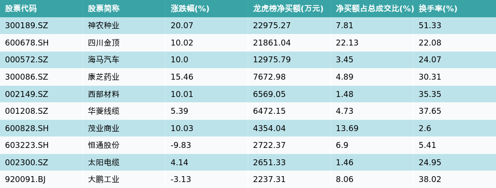 南财智讯12月10日电,南财金融终端数据显示,因当日异动登上龙虎榜的个股中,资金净买入最多的前三位分别是神农种业(300189.SZ)、四川金顶(600678.SH)与海马汽车(000572.SZ)。其中排名第一的神农种业净买额达2.3亿元,占总成交金额的7.81%。神农种业当日收盘上涨20.07%,换手率为51.33%,净买入额前10个股详情见下图: