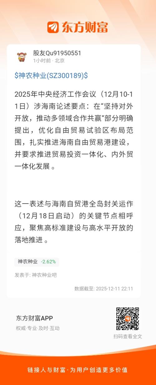 2025年中央经济工作会议(12月10-11日)涉海南论述要点:在“坚持对外开放,推动多领域合作共赢”部分明确提出,优化自由贸易试验区布局范围,扎实推进海南自由贸易港建设,并要求推进贸易投资一体化、内外贸一体化发展 。