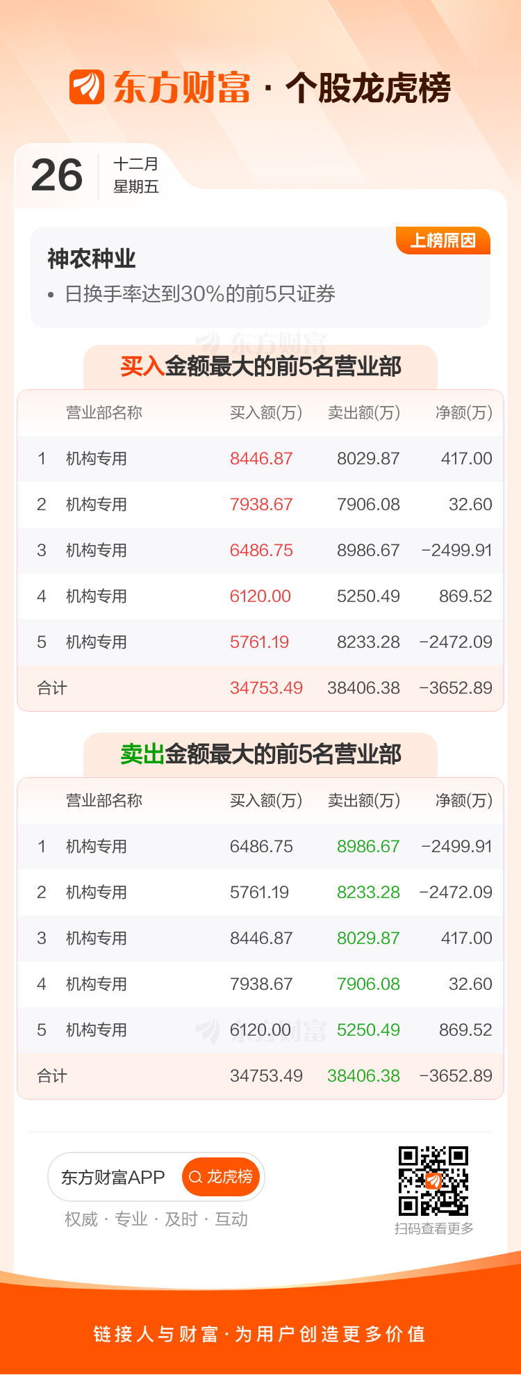 交易所2025年12月26日公布的交易公开信息显示,神农种业因成为日换手率达到30%的前5只证券上榜。神农种业当日收报8.06元,涨跌幅7.32%,偏离值45.11%,换手率45.11%,成交额32.61亿。