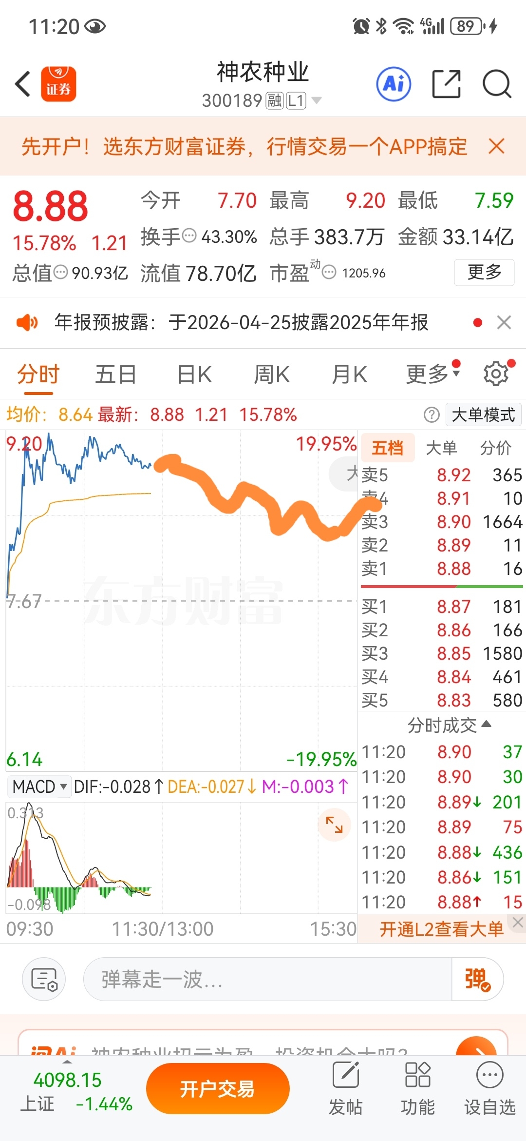 $神农种业(SZ300189)$ 11点没涨停,小散就不要再买了,基本上都是冲高回落的套套,能跑的散户也尽量先跑,预计今日走势如下图,标准的钓鱼线,尾盘还要跳水