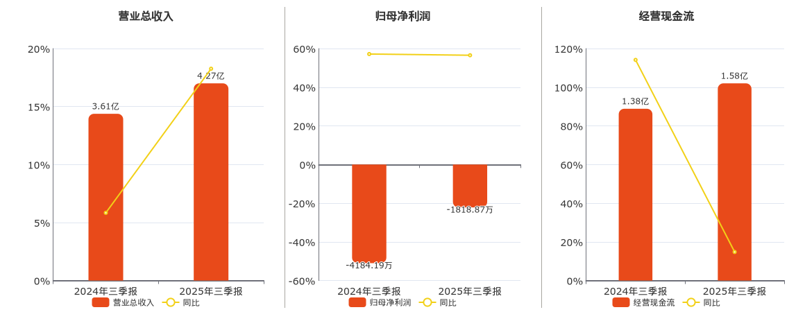 公司营业总收入为4.27亿元。归母净利润为-1818.87万元。经营活动现金净流入为1.58亿元。