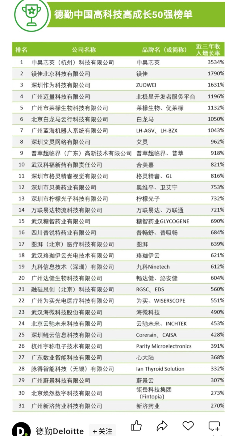 $科德教育(SZ300192)$ 中昊芯英入选德勤高科技高成长50强。德勤高科技高成长评选项目1995年创办于美国硅谷,2005年进入中国,每年在数十个国家和地区举办。历年榜单中涌现出许多行业翘楚,如:腾讯、阿里巴巴、百度、京东、中芯国际、药明康德、字节跳动、苹果、微软、谷歌、特斯拉、英伟达等。企业入选榜单时通常处于早期阶段,该榜单又被誉为“伟大科技企业的摇篮”。