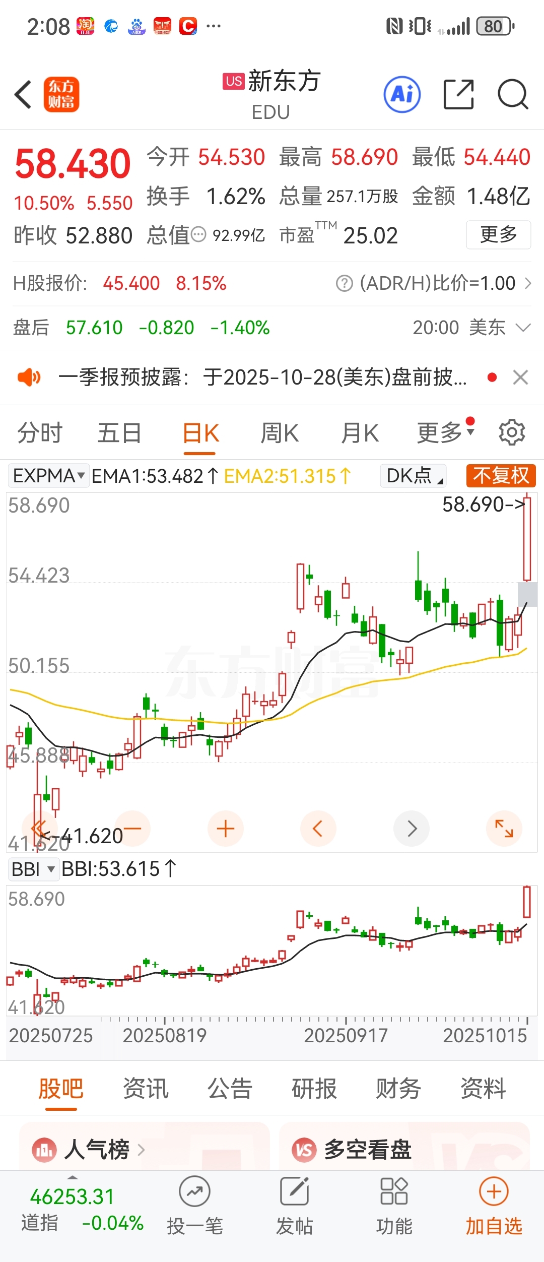 教育股反正要起来,看你跌到哪里去,新东方大涨