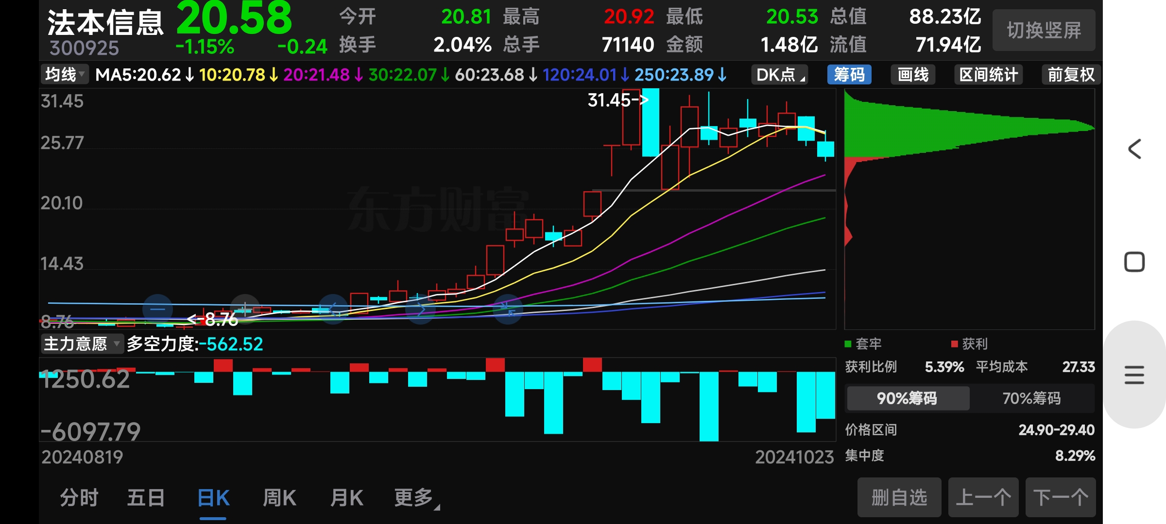 $科德教育(SZ300192)$ 去年参与了法本信息,从8元到32,第一个20厘米后,第二天跌百分之五,震荡一周,再来一个20厘米,以后的走势中也有5个点到10个点的下跌,最后还有一个20厘米跌停,然后高位震荡了好长时间,有充分时间出货,观察一下科德是不是有备而来?