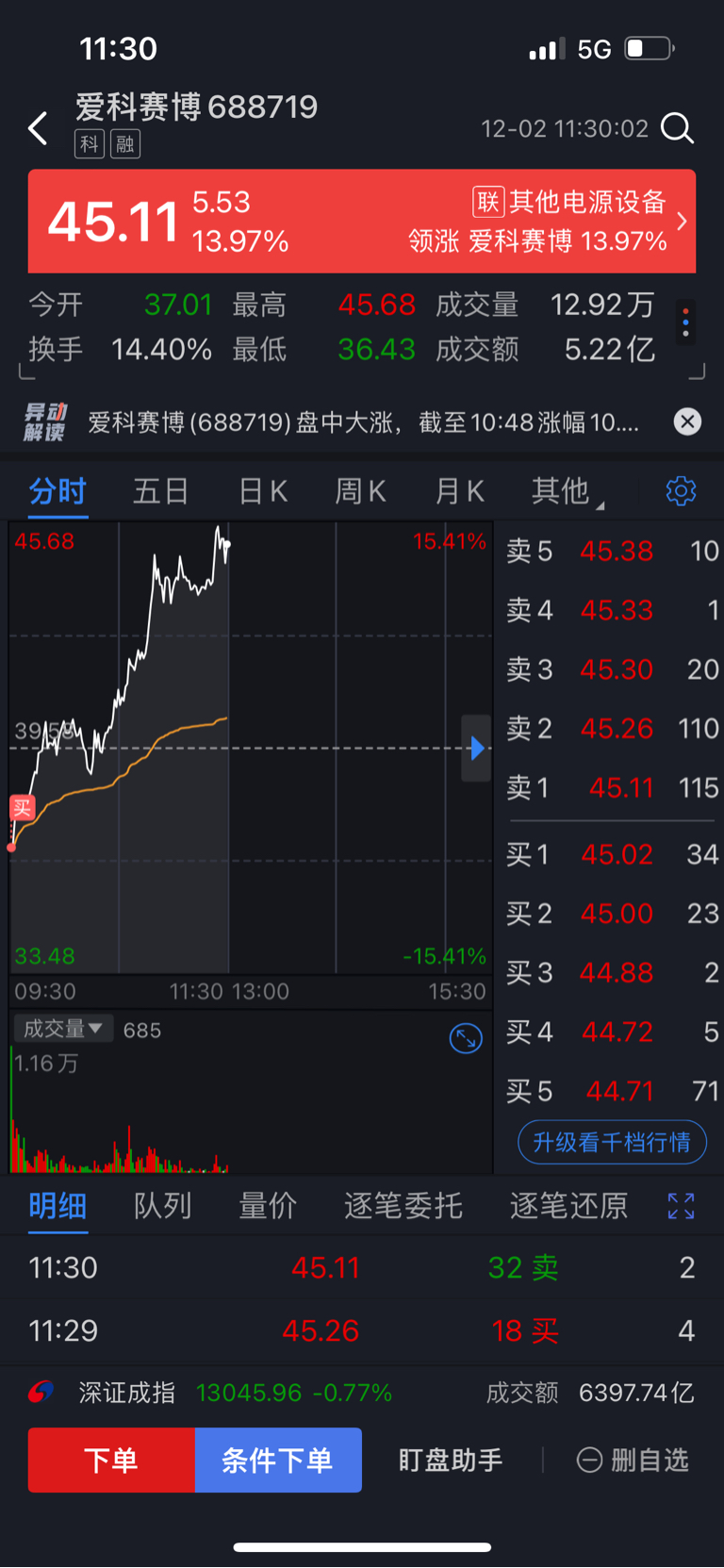 上午大跌,补回科德、艾布鲁,加仓荣信文化(居然加到小荣的最低价3140 ,但科补早了五毛,艾补的马马虎虎)。小仓位打野两支。一支小赚,一支有惊喜。可惜只买了几千股爱科赛博,负七买入,目前拉到正十四,太狂了。