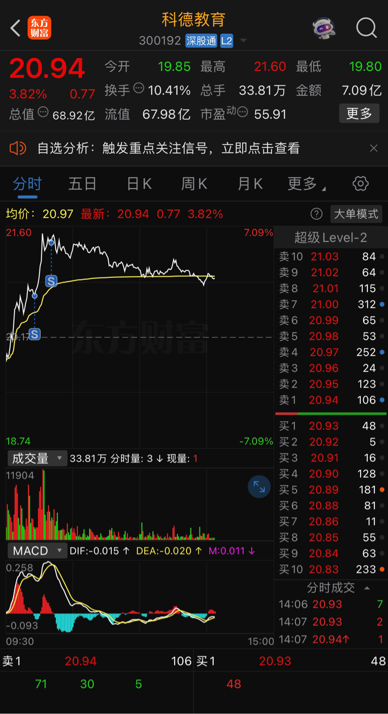 $科德教育(SZ300192)$ 早盘分两批清了,明后天看情况再接,大盘连冲两天了,见好就收,祝车上的兄弟发财。