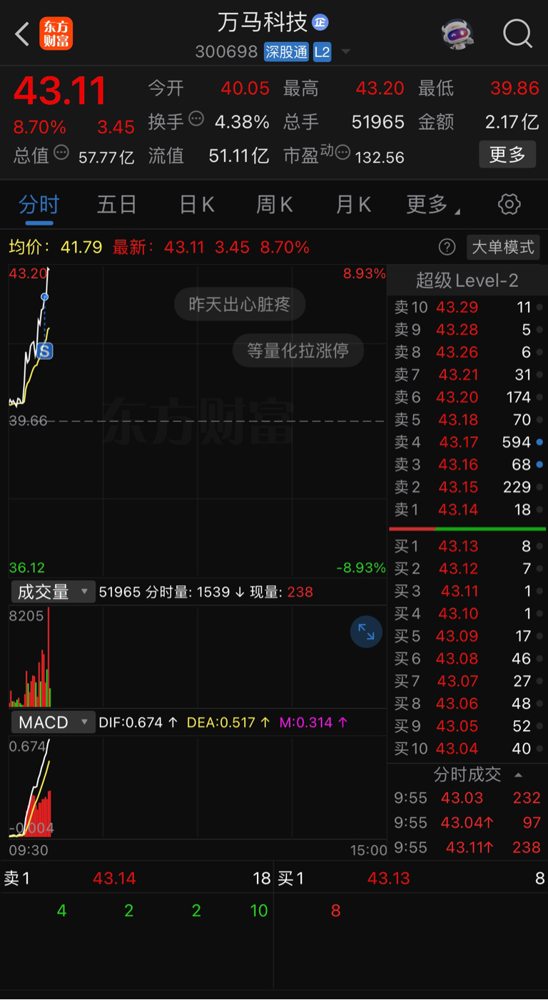 $科德教育(SZ300192)$ $万马科技(SZ300698)$ 昨天尾盘进的万马,没想到今天这么给力,不贪,7个点出了,然后水下再慢慢补科德,爽歪歪