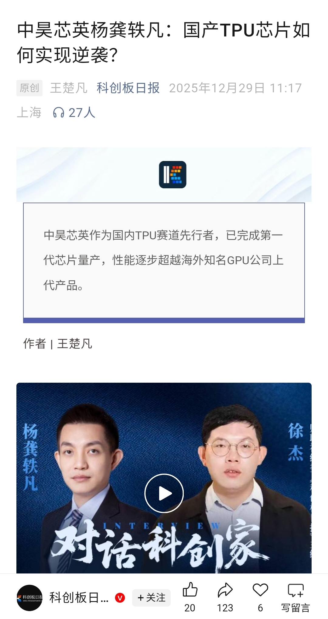 科创板日报公众号发表采访中昊芯英杨龚轶凡的数千字文稿。请自行查阅。