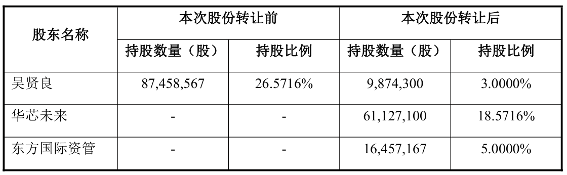 具体协议显示,吴贤良拟将其持有的公司7758万股无限售条件流通股转让给华芯未来和东方国际资管,转让对价合计13.35亿元。其中,华芯未来协议受让公司6113万股股份,占公司股份总数的18.57%,东方国际资管协议受让公司1646万股股份,占公司股份总数的5%。