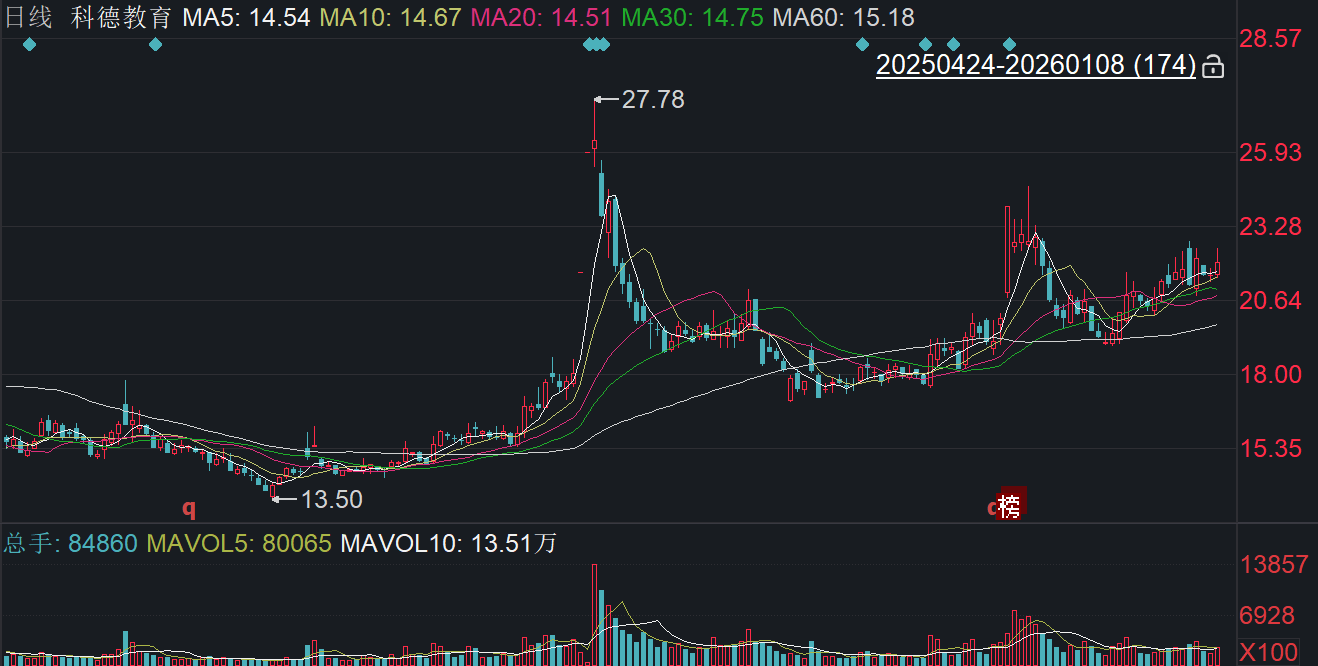 二级市场上,截至1月8日收盘,科德教育上涨2.14%报21.97元/股,总市值约72.31亿元,近一年公司股价累计上涨约五成。