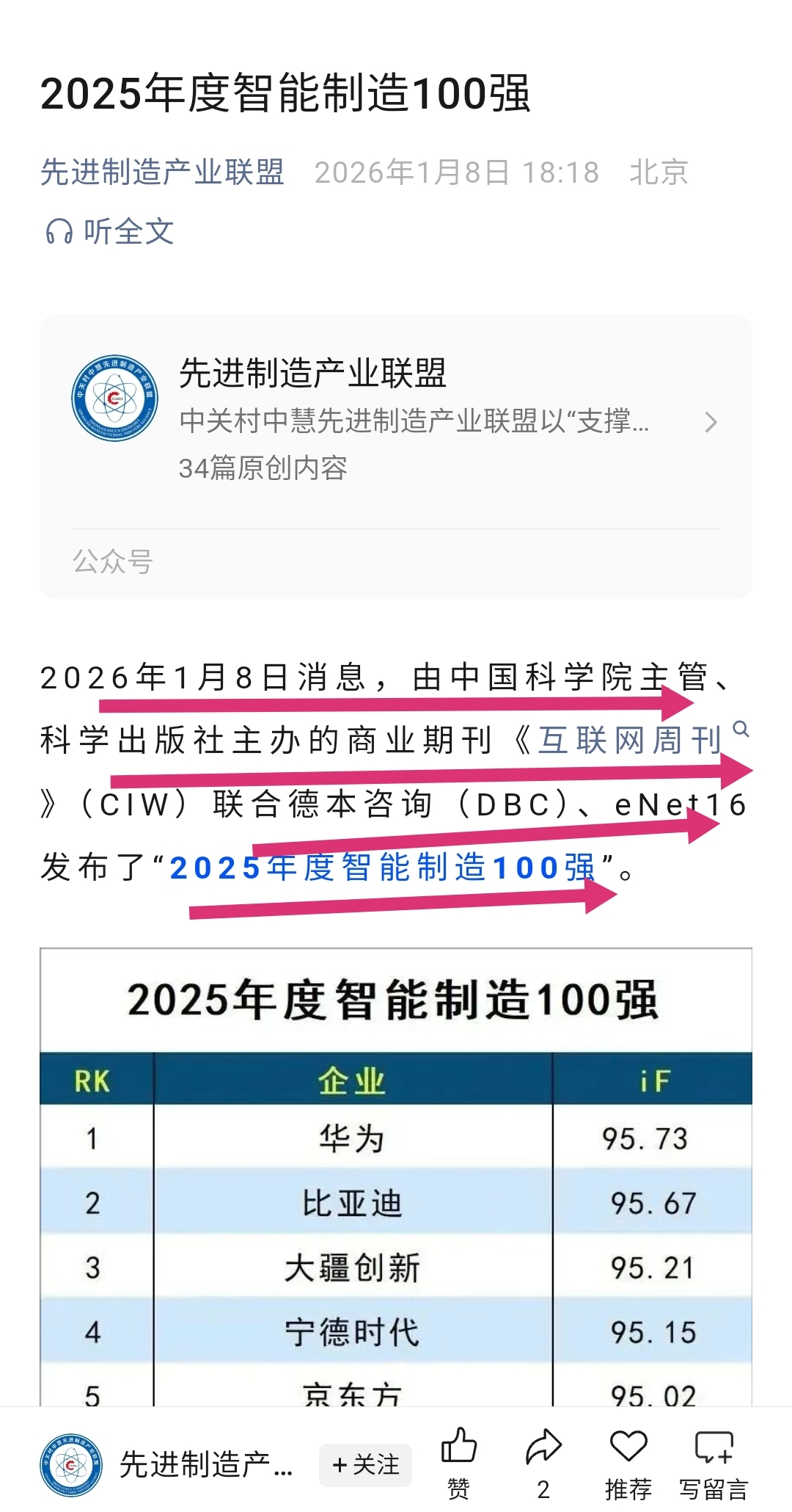 $科德教育(SZ300192)$ $天普股份(SH605255)$ $艾布鲁(SZ301259)$ 2026年1月8日消息,中昊芯英以73.48分第66名,入选由中国科学院主管、科学出版社主办的商业期刊《互联网周刊》(CIW)联合德本咨询(DBC)、eNet16发布了“2025年度智能制造100强”。