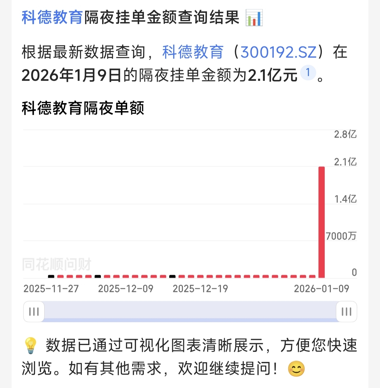 $科德教育(SZ300192)$ 2025年12月27日至2026年1月9日每天隔夜挂单柱状图
